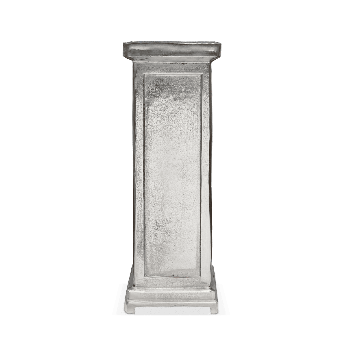 Square Tall Pedestal Large in Raw Silver offers a contemporary way to showcase your favorite decorative pieces. Its clean lines and metallic sheen add structure and sophistication to open spaces.