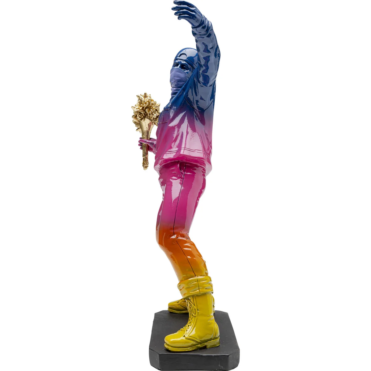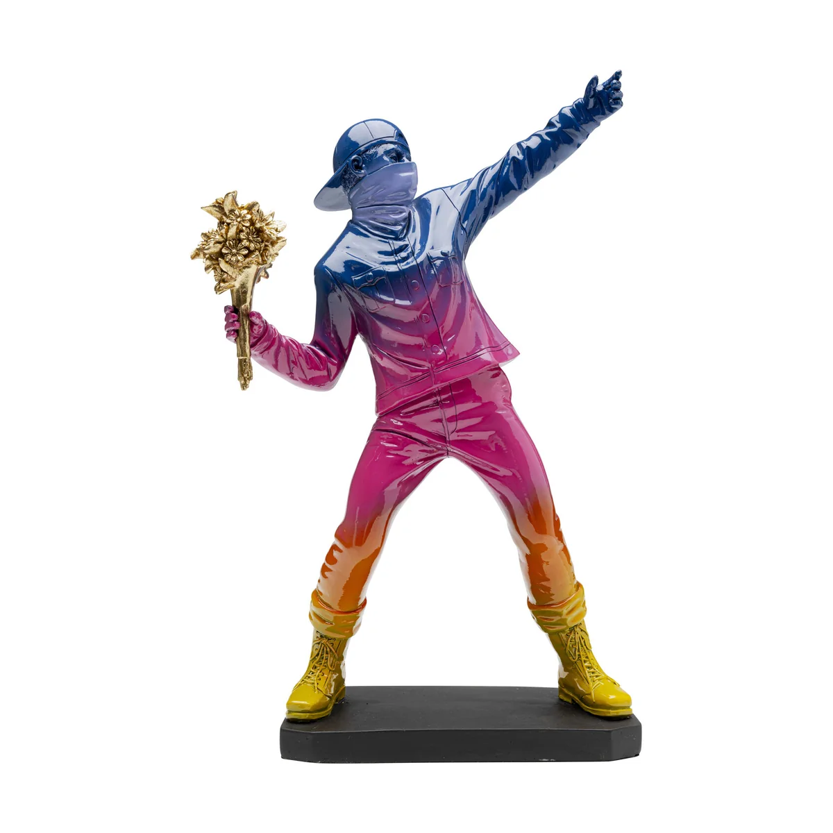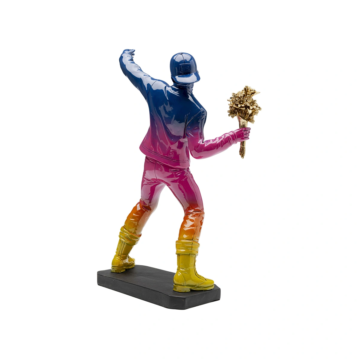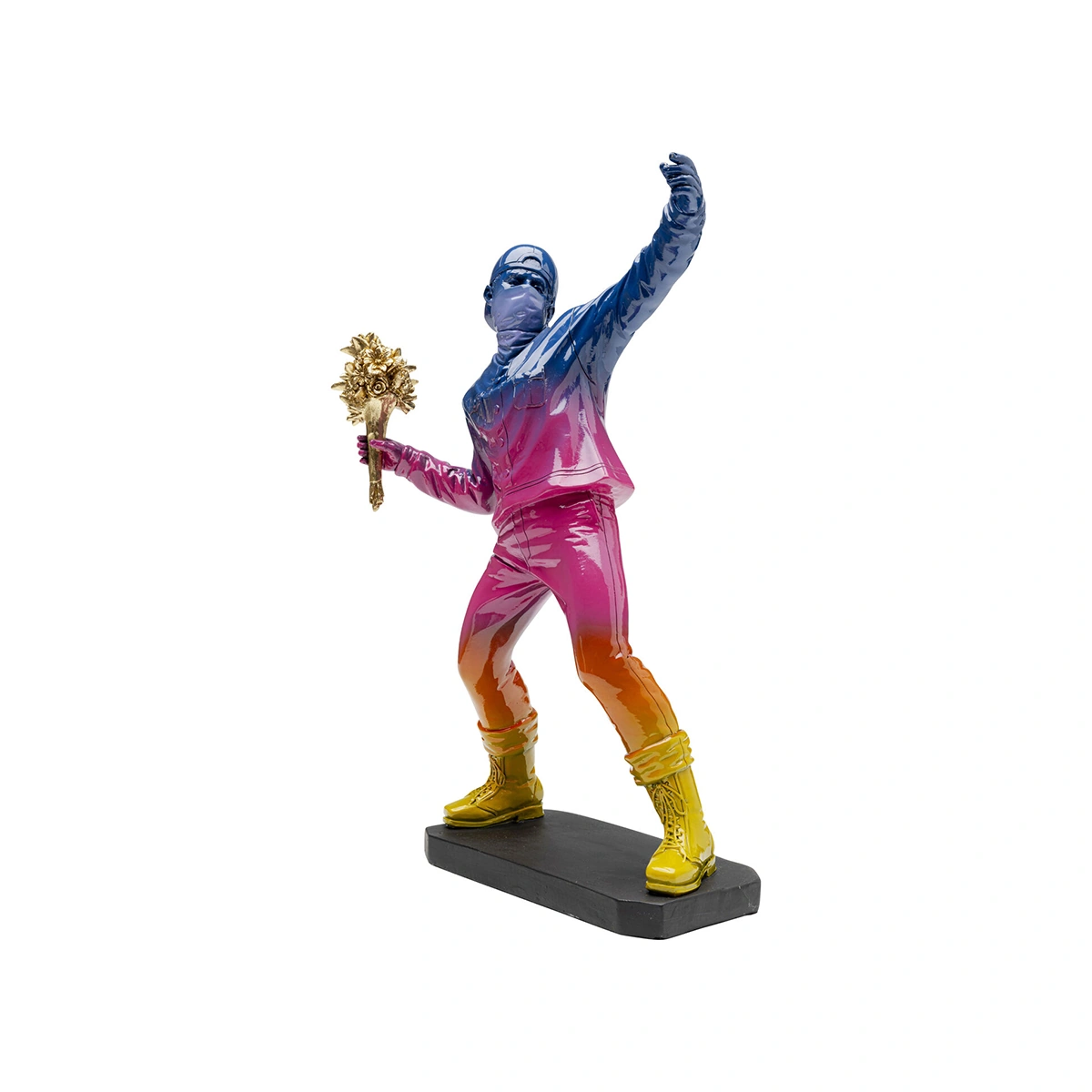 The figurine showcases a man holding a vibrant bouquet of flowers, standing at dimensions of 24x14x39.5 cm. Crafted from robust polyresin and hand-painted in bright colors, the detailed design and expressive pose make this piece a true conversation starter. The rich color gradient and the golden bouquet of flowers add a pop of color to sideboards, chests of drawers or shelves.