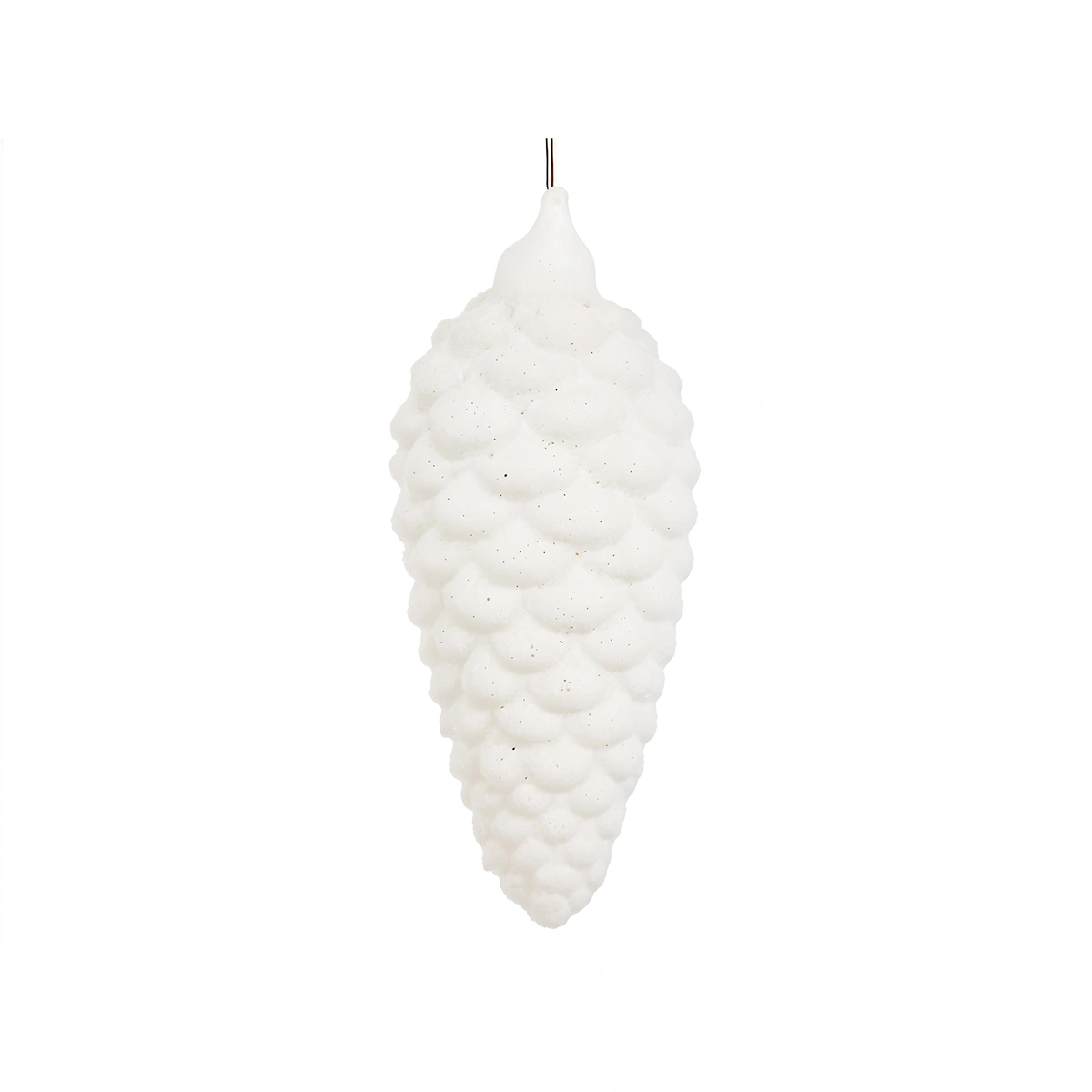 Key features of this ornament include its 11cm size, sparkling translucent finish, and its high-quality white glass material. Its medium size offers versatility in placement, while its unique sugared cone design adds a touch of elegance to your holiday decor.