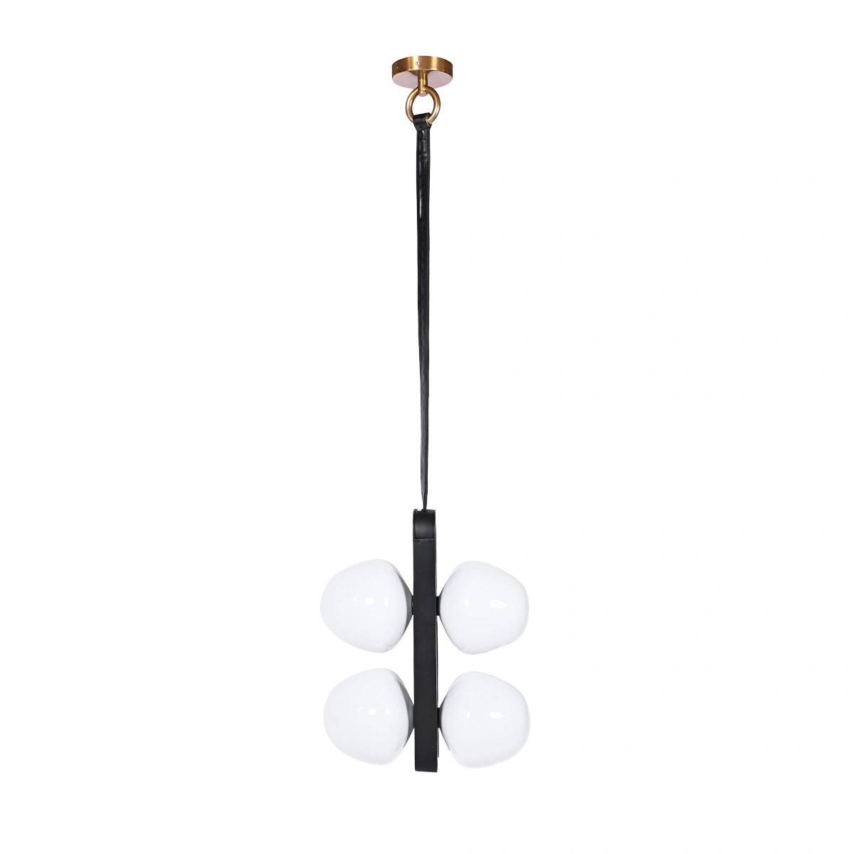At 51 cm long and 51 cm wide, the pendant is elegantly framed in aluminium and brass with a black and gold finish, complemented by a tinted glass shade. The detail is further accentuated with a leather accent trim, providing a luxurious touch to the pendant.