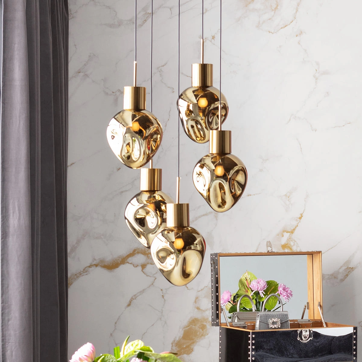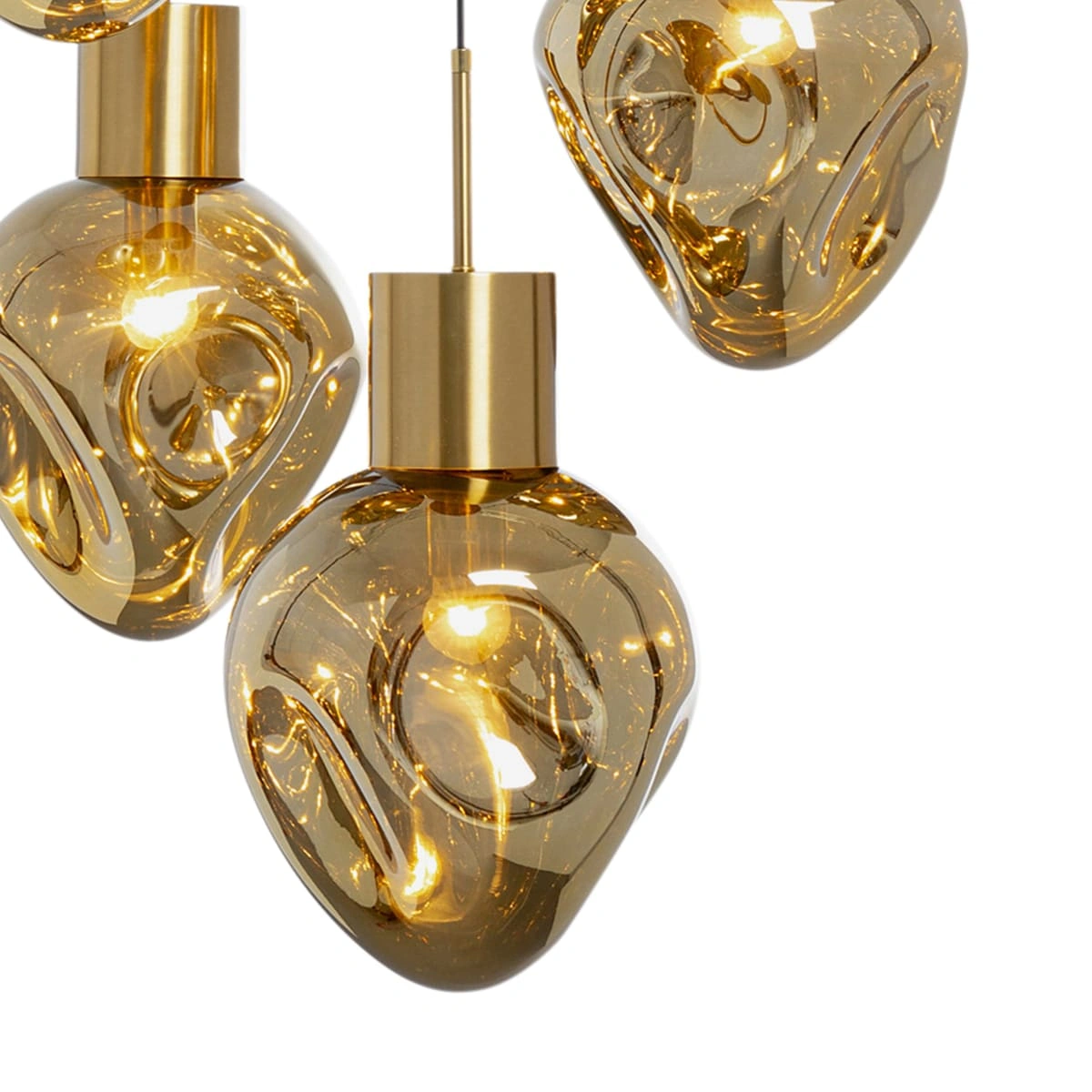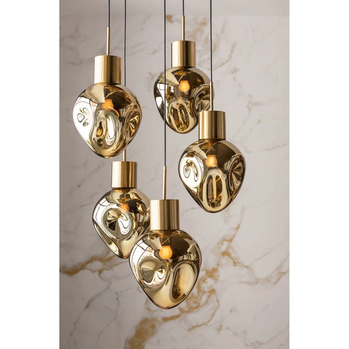 Ignite your living space with the Supernova Cinque Pendant Lamp in golden electroplated glass. This modern designer lamp adds a touch of elegance and sophistication to any room.