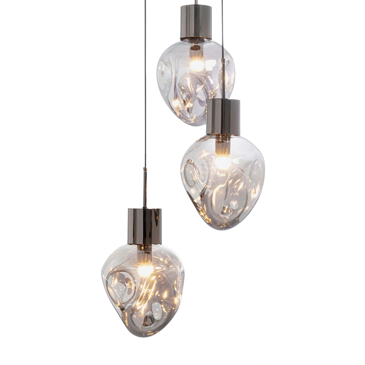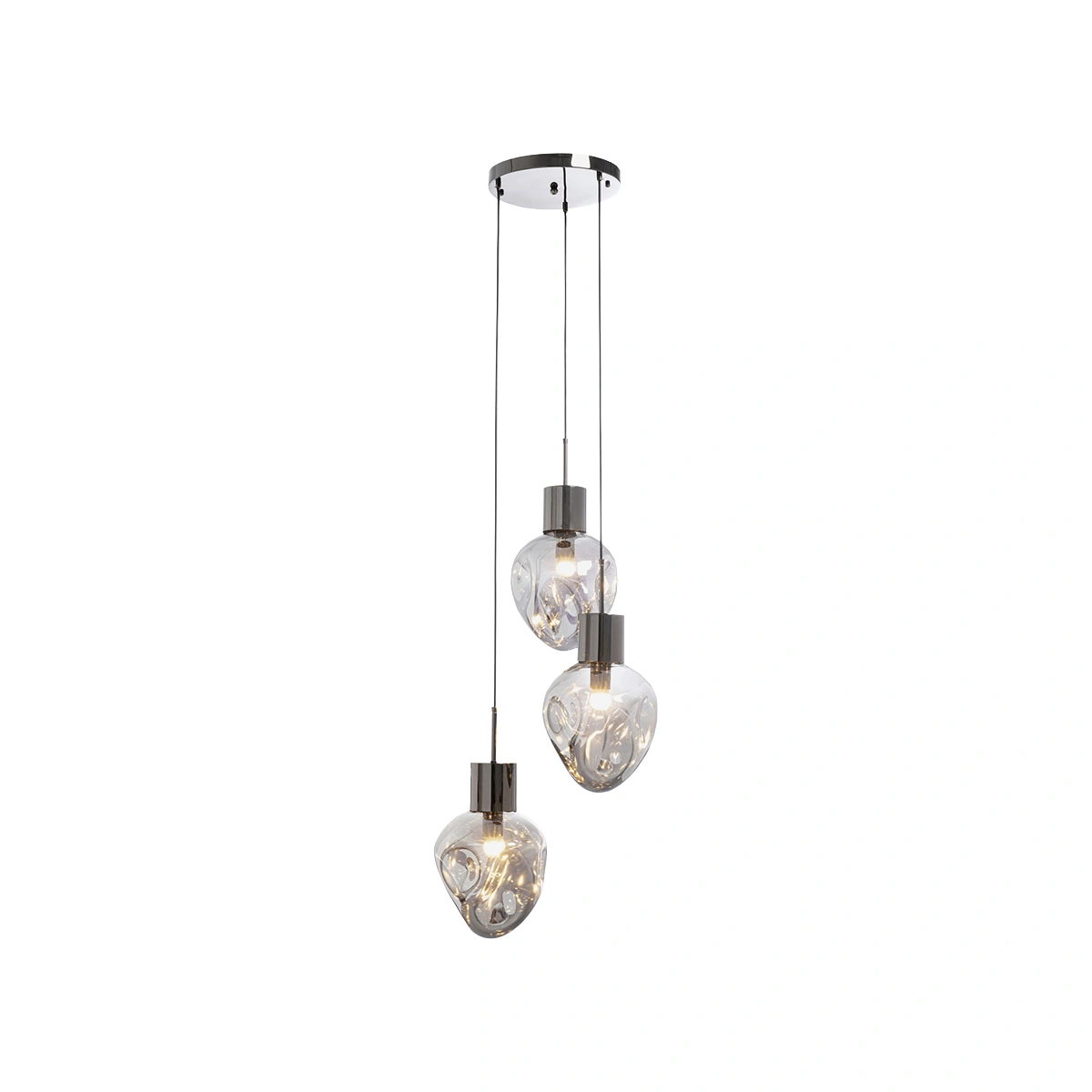 Featuring three uniquely shaped and shimmering silver-grey glass spheres, this pendant light creates an impressive visual statement. The organically shaped shades are set at varying heights, spanning across a 160 x 45 x 45 cm dimension. Crafted with a chrome-plated steel ceiling canopy and lamp holders, the lamp's height is adjustable from 50 to 160 cm, allowing for versatile installation.