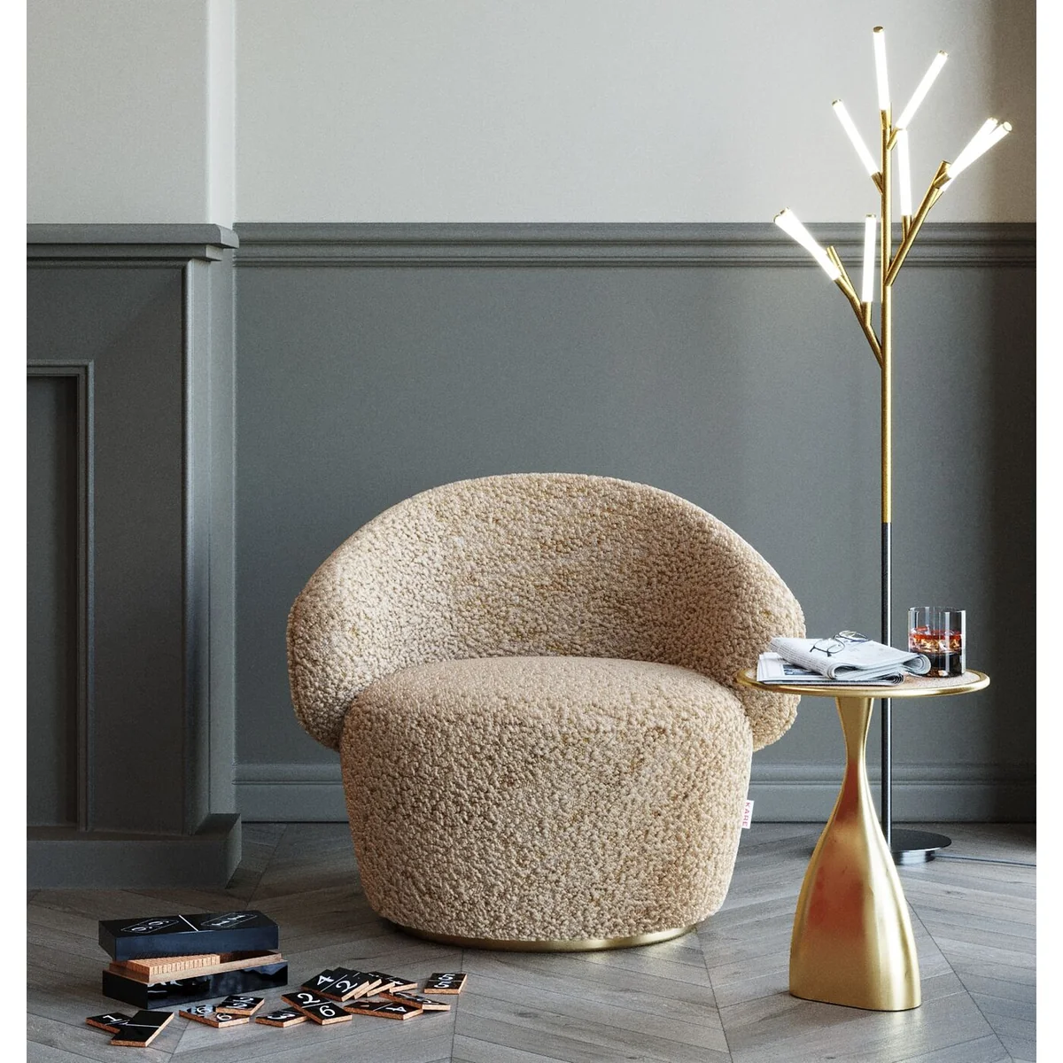 The Carella Swivel Armchair in beige plywood is a beautiful addition to any room in your home. Its natural, untreated finish brings a touch of simplicity and elegance.