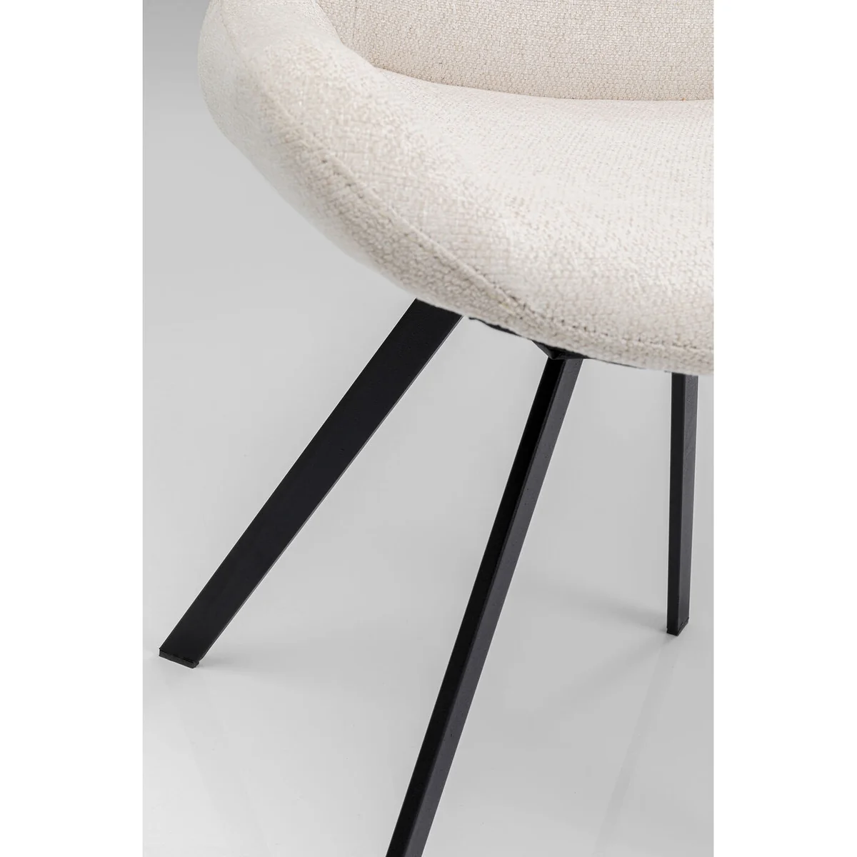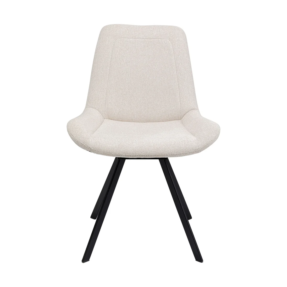 Key features include a swivel base allowing for 360-degree rotation, a lush cream-colored polyester chenille upholstery, and a compact size with dimensions of 57 cm length, 63 cm width, and 88 cm height. The structure of this chair guarantees durability and long-lasting use.