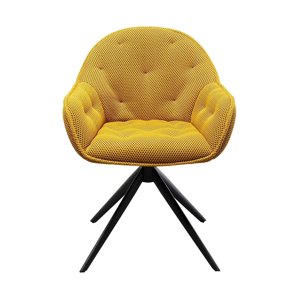 Our interior designers recommend this innovative swivel chair with armrests, which stands out with its sunny yellow color and ultra-modern mesh fabric cover. It instantly transforms any dining area into a stylish, modern space and the positive yellow spreads a good mood. The structured mesh fabric consists of fine, interwoven fibers that create an airy and transparent appearance with a net look. This modern textile structure gives the chair a unique and appealing design that fits perfectly into a contemporary living or working area.
