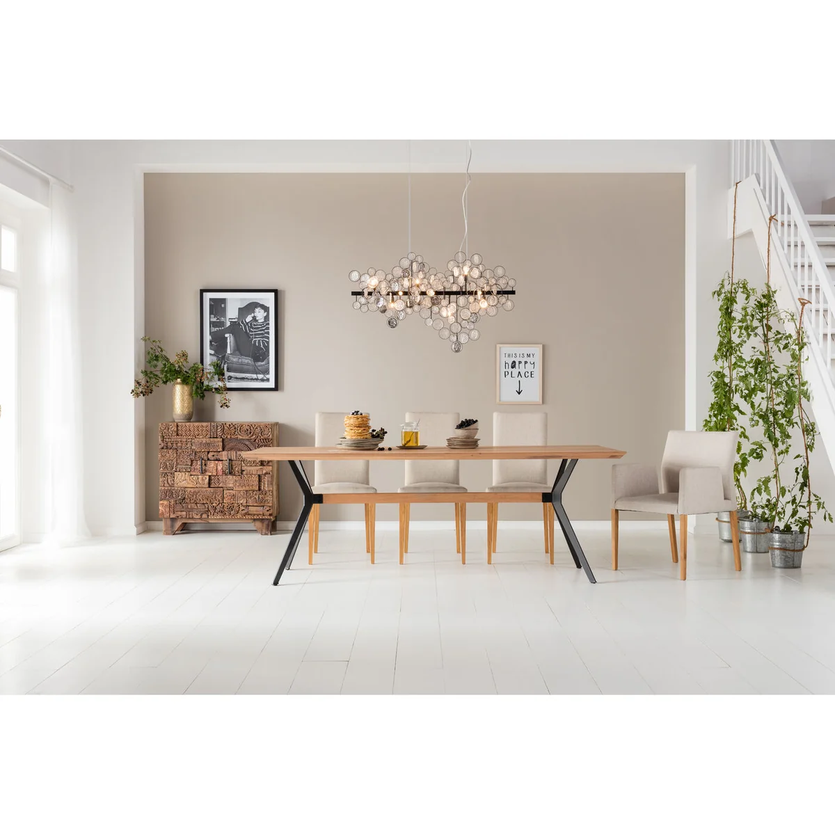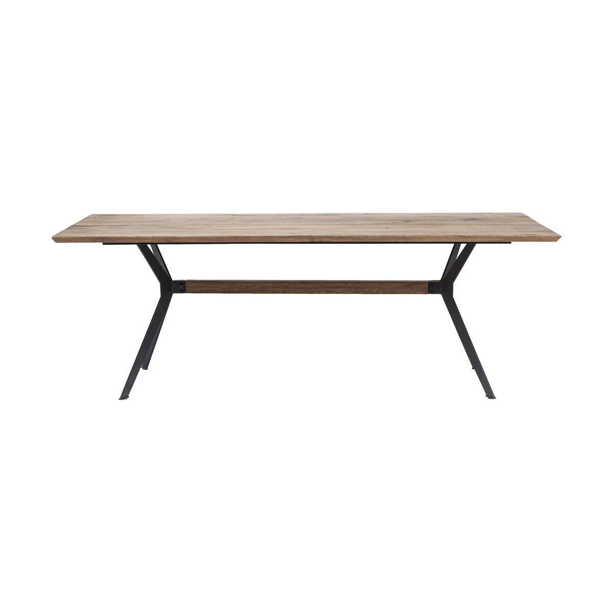 A dining table with design quality. It is characterised on the one hand by the lively surface of the solid oak table top, which tells of the natural growth of the tree. Its treatment with clear lacquer protects and emphasises the wood features. At the same time the dynamically shaped base in black steel is also striking, giving the large table dynamism and lightness. As a stylish extra, the wooden central strut of the table frame harmonises with the top.
