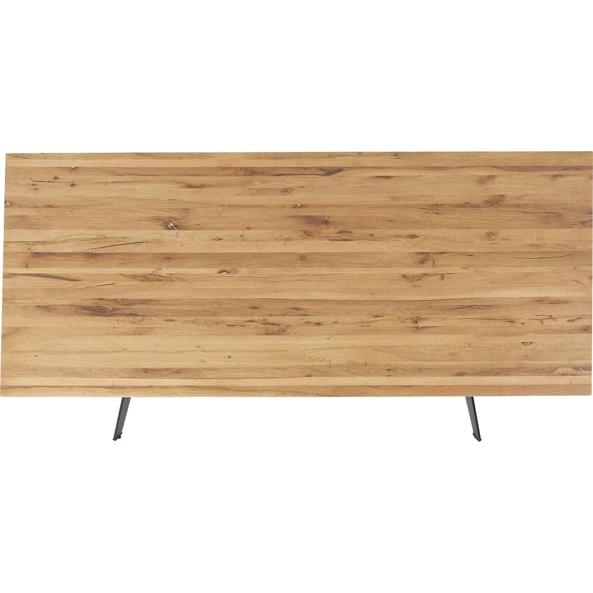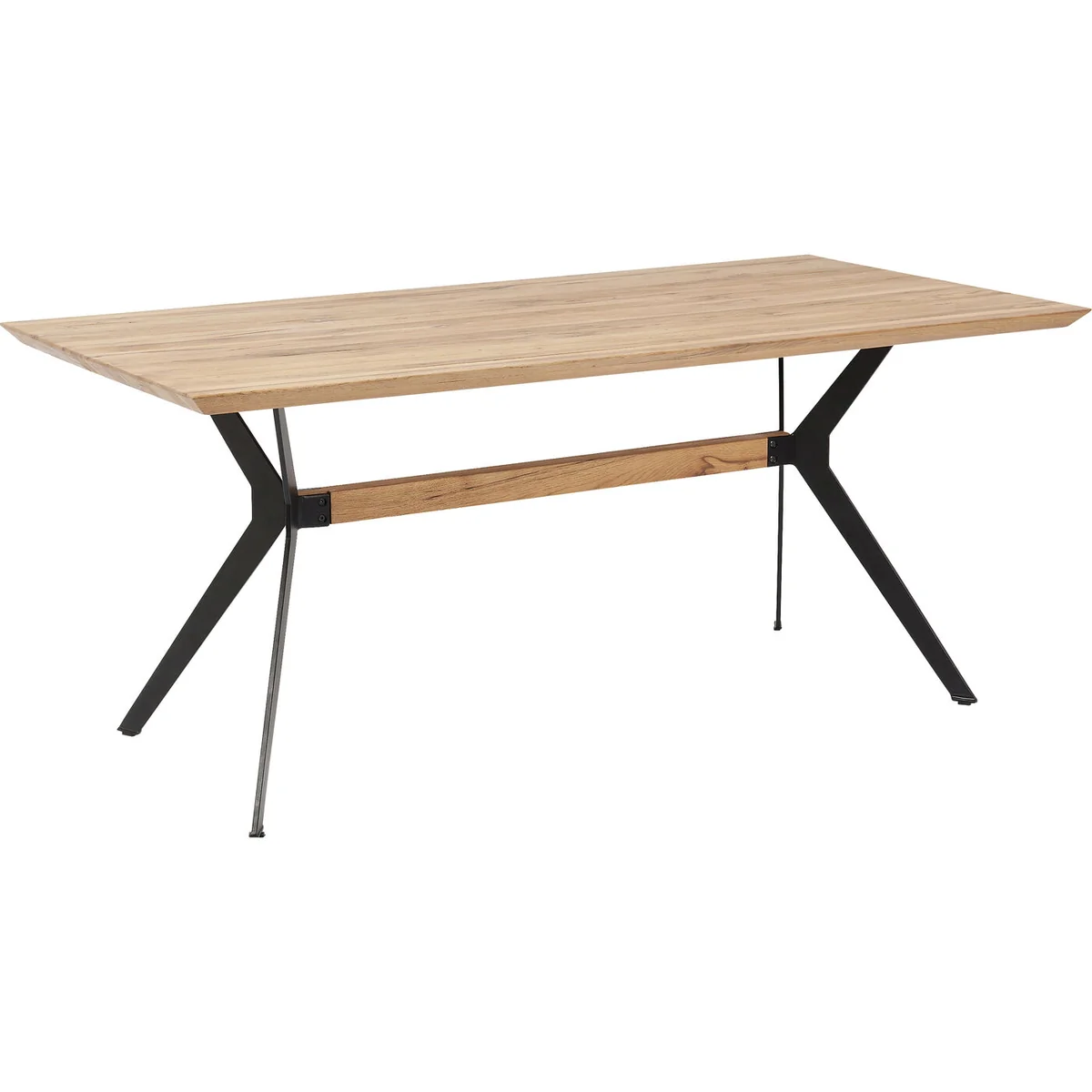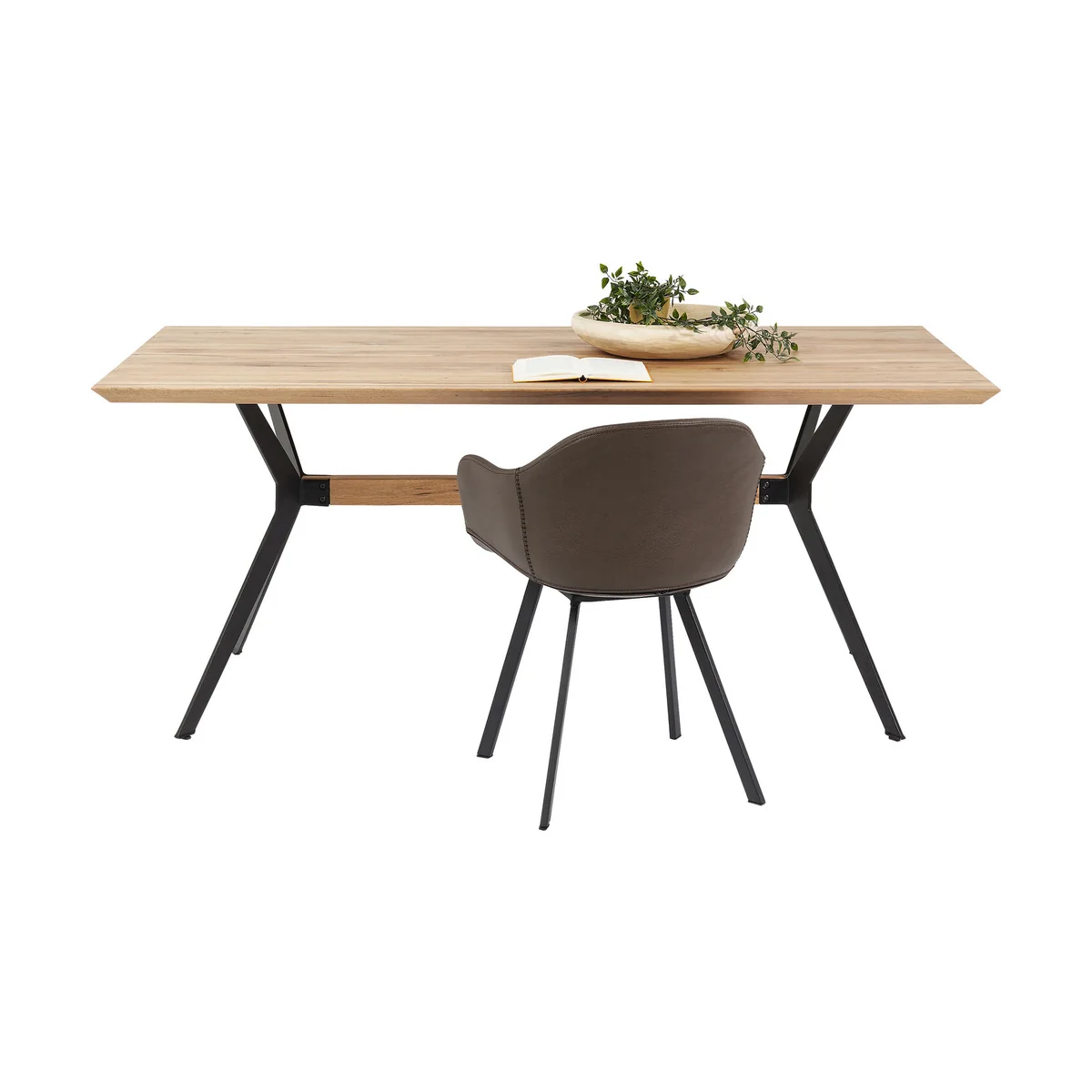 The Downtown Dining Table in brown oak and steel is a refined centerpiece for modern dining rooms or contemporary meeting spaces. This designer table features a solid oiled oak top with bevelled edges, set atop a dynamically shaped powder-coated steel base for added visual interest and legroom. Perfectly sized at 180x90cm, it seats up to 6 people comfortably.