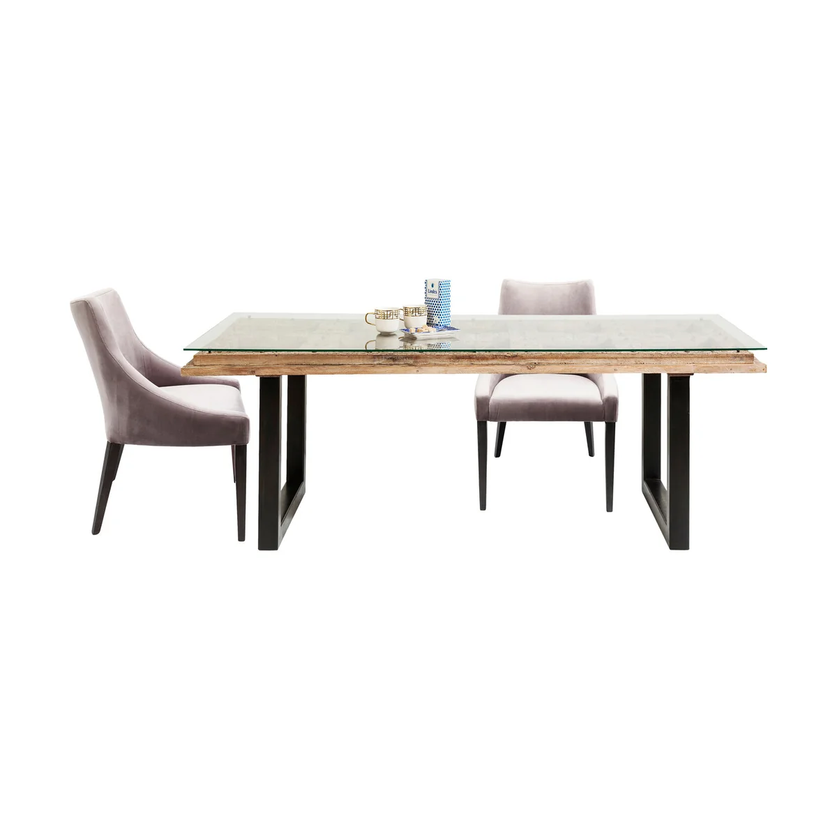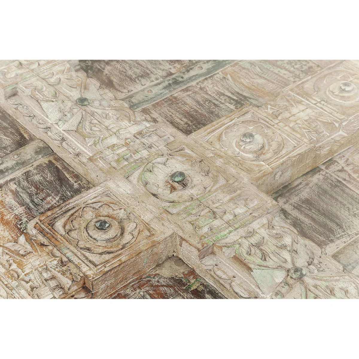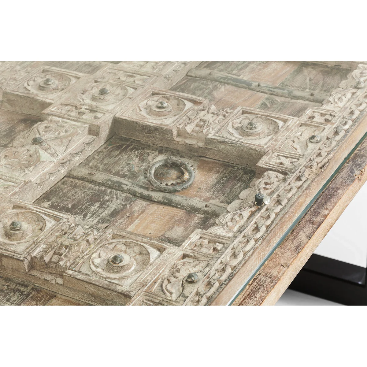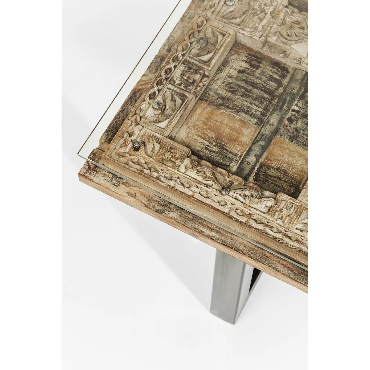 Characterful dining table from the Kalif series, which artfully combines vintage details with modern elements. The table top made of safety glass (ESG) seems to float and reveals an antique door richly decorated with inlays. Each piece is unique. Series: Kalif. Offers space for 6-8 people.