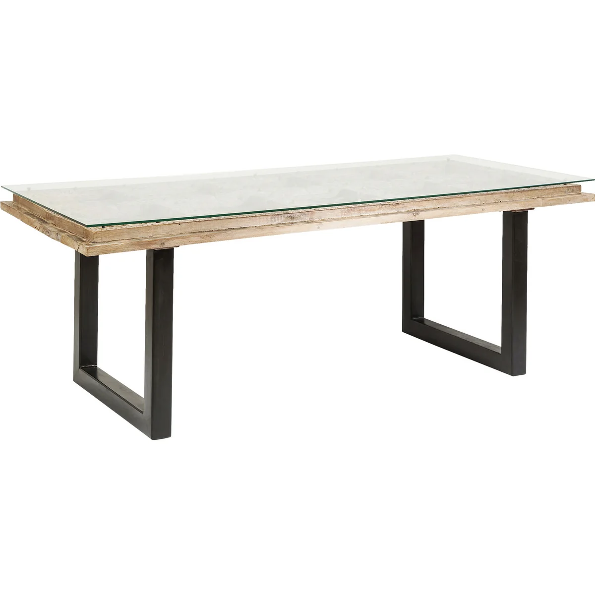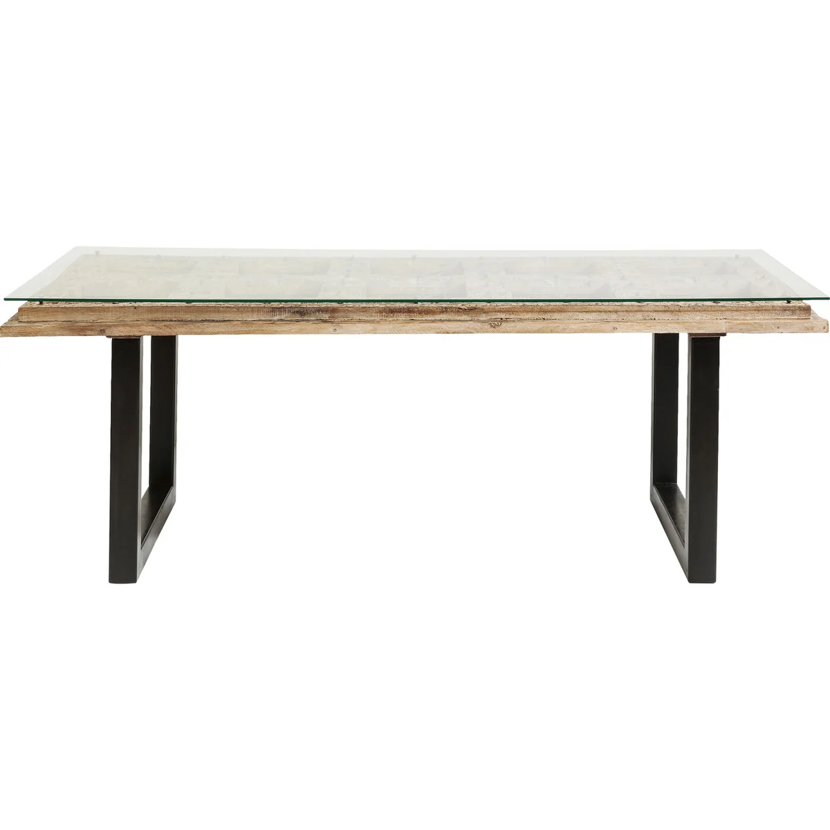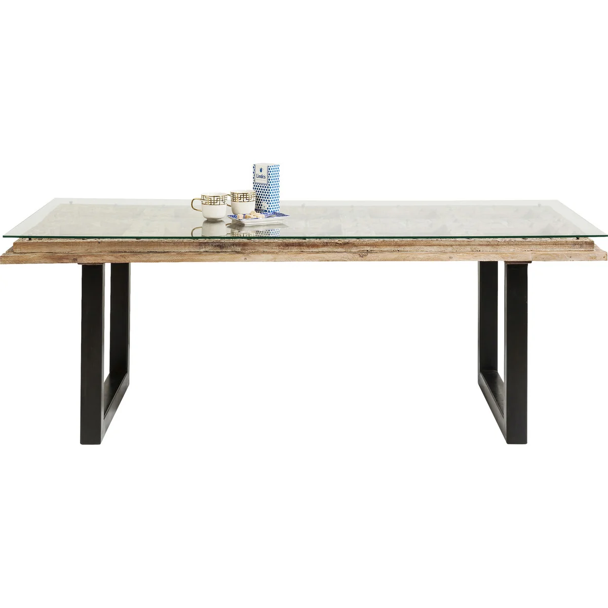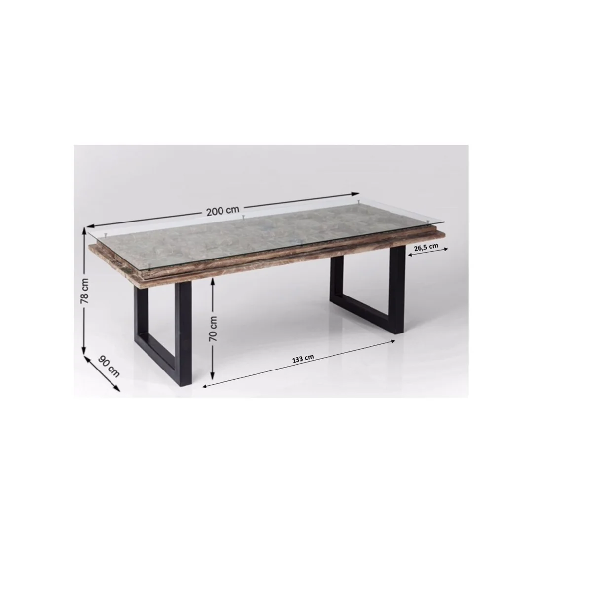 Characterful dining table from the Kalif series, which artfully combines vintage details with modern elements. The table top made of safety glass (ESG) seems to float and reveals an antique door richly decorated with inlays. Each piece is unique. Series: Kalif. Offers space for 6-8 people.