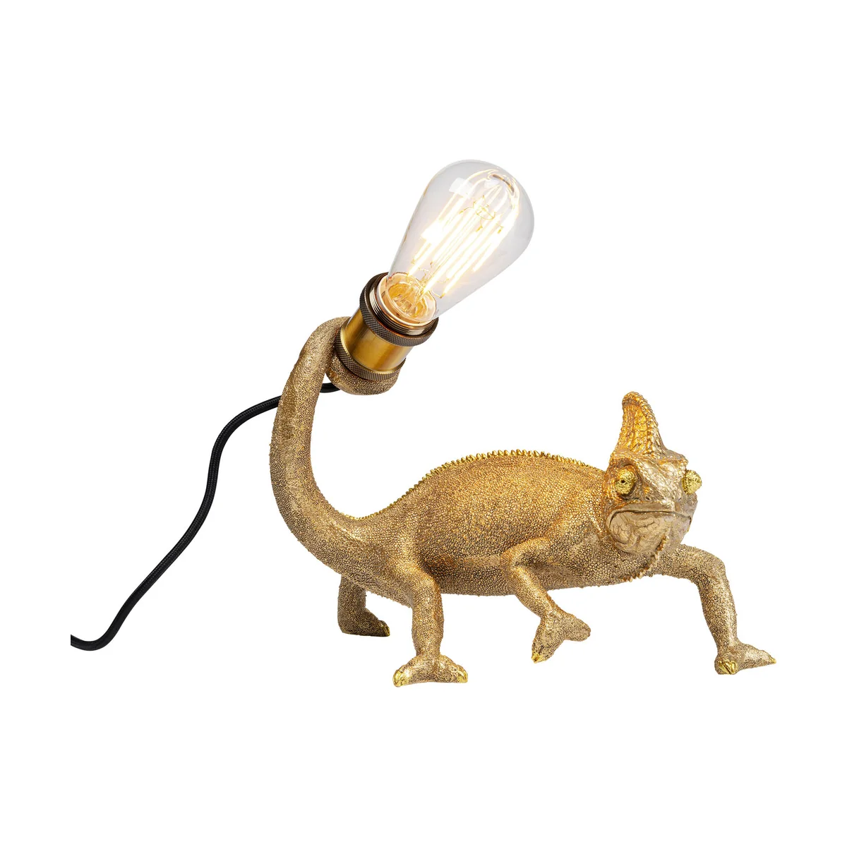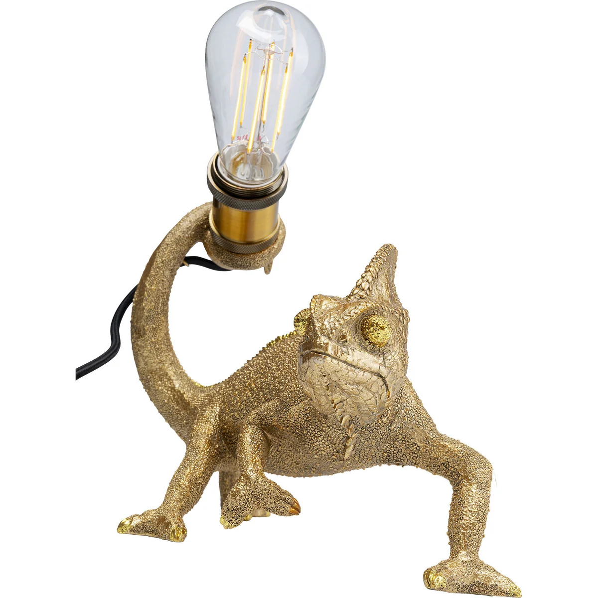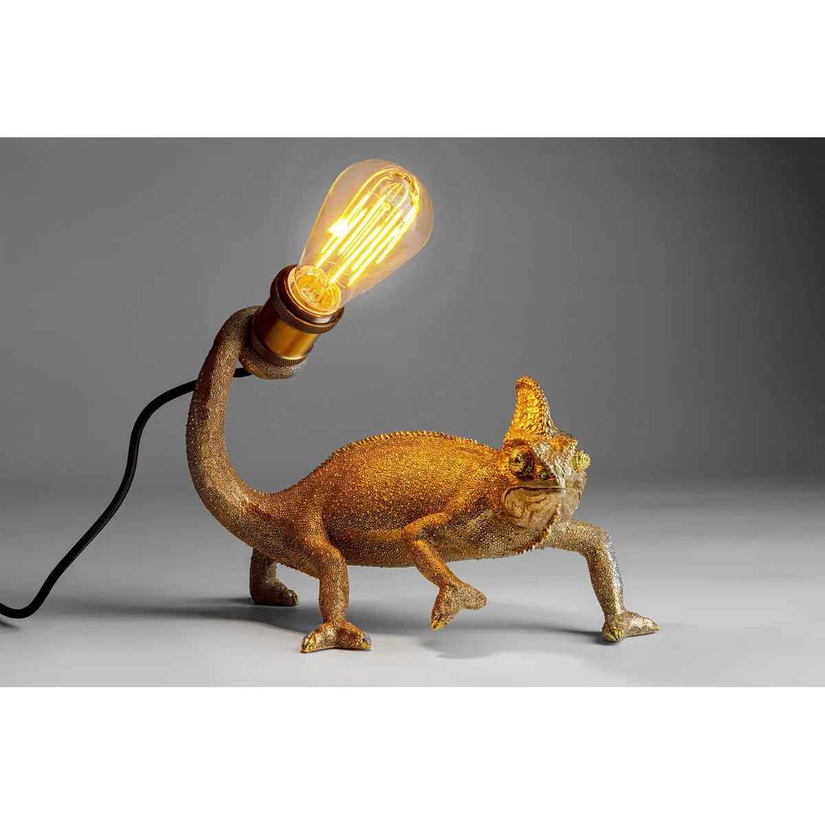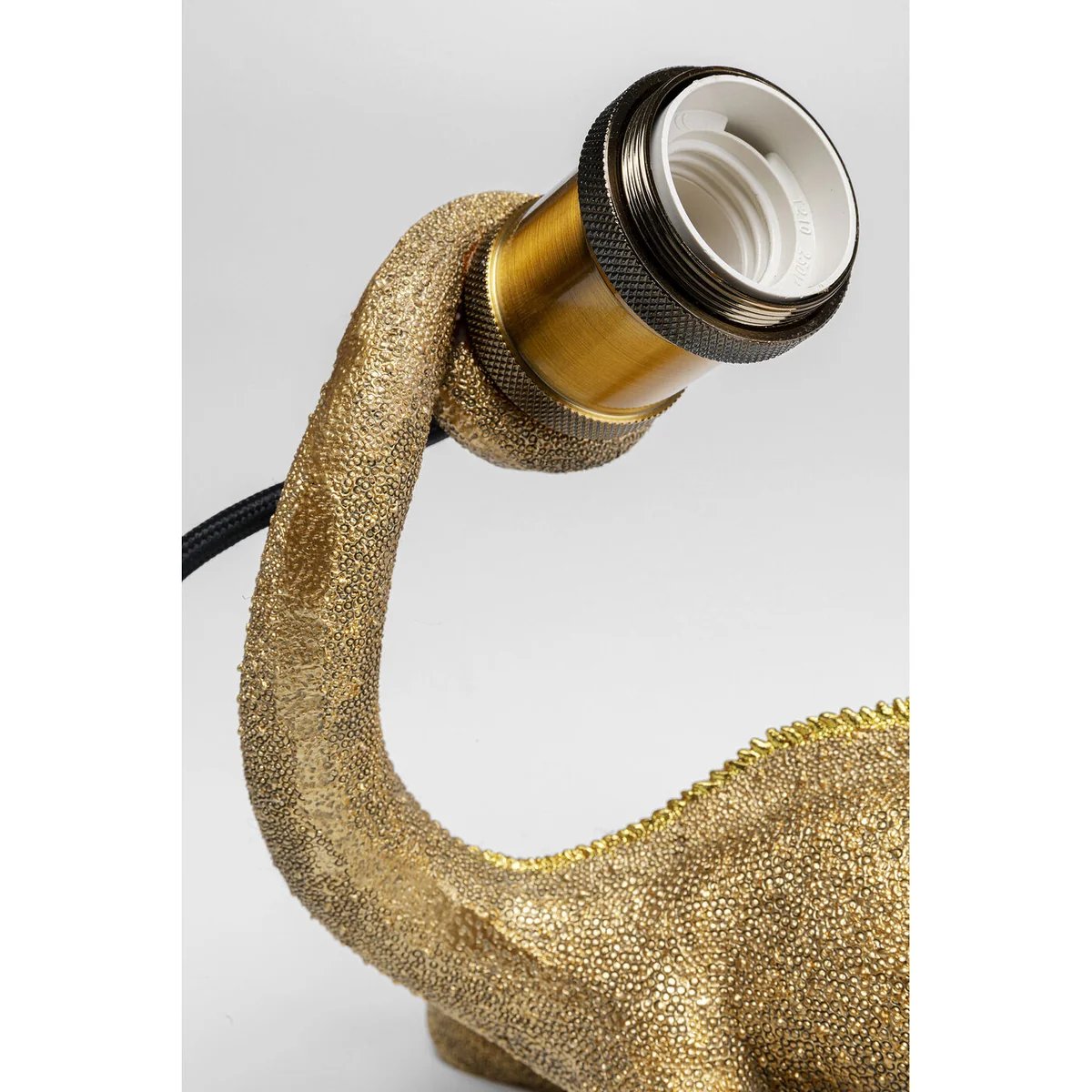 This animal lamp is a real eye-catcher - even when the light is switched off. The lovingly created and lifelike design of the chameleon figure made of polyresin is given a glamorous touch by the golden colour. The mood lighting plays a decisive role in creating a homely atmosphere - this table lamp in an original design provides an exhilarating ray of light on the sideboard, on the bedside table or even in the bookcase.