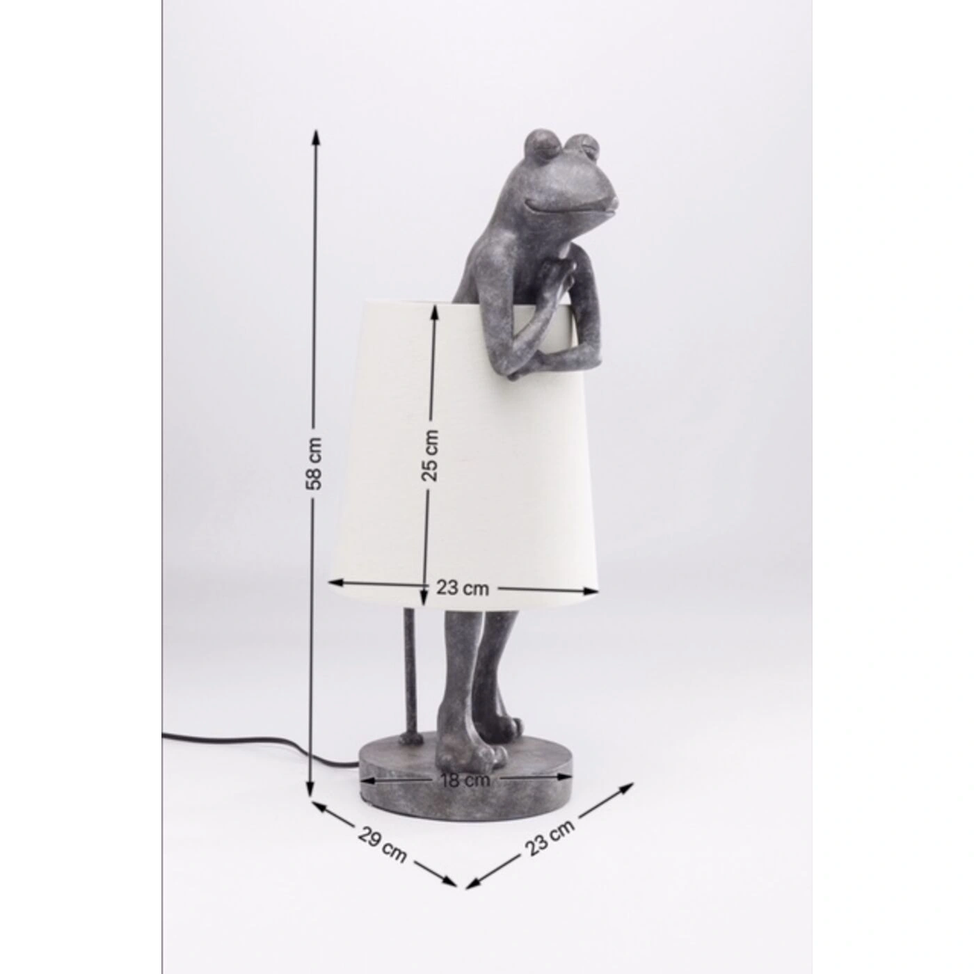 Key features of this lamp include its distinctive frog design, painted in a soft, neutral grey color. The lamp measures 23 cm in length, 29 cm in depth, and 58 cm in height, making it a substantial statement piece. The lamp's body is made from sturdy polyresin, ensuring it will last for years.