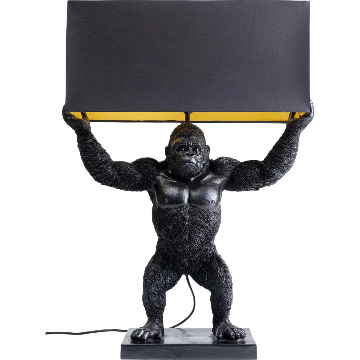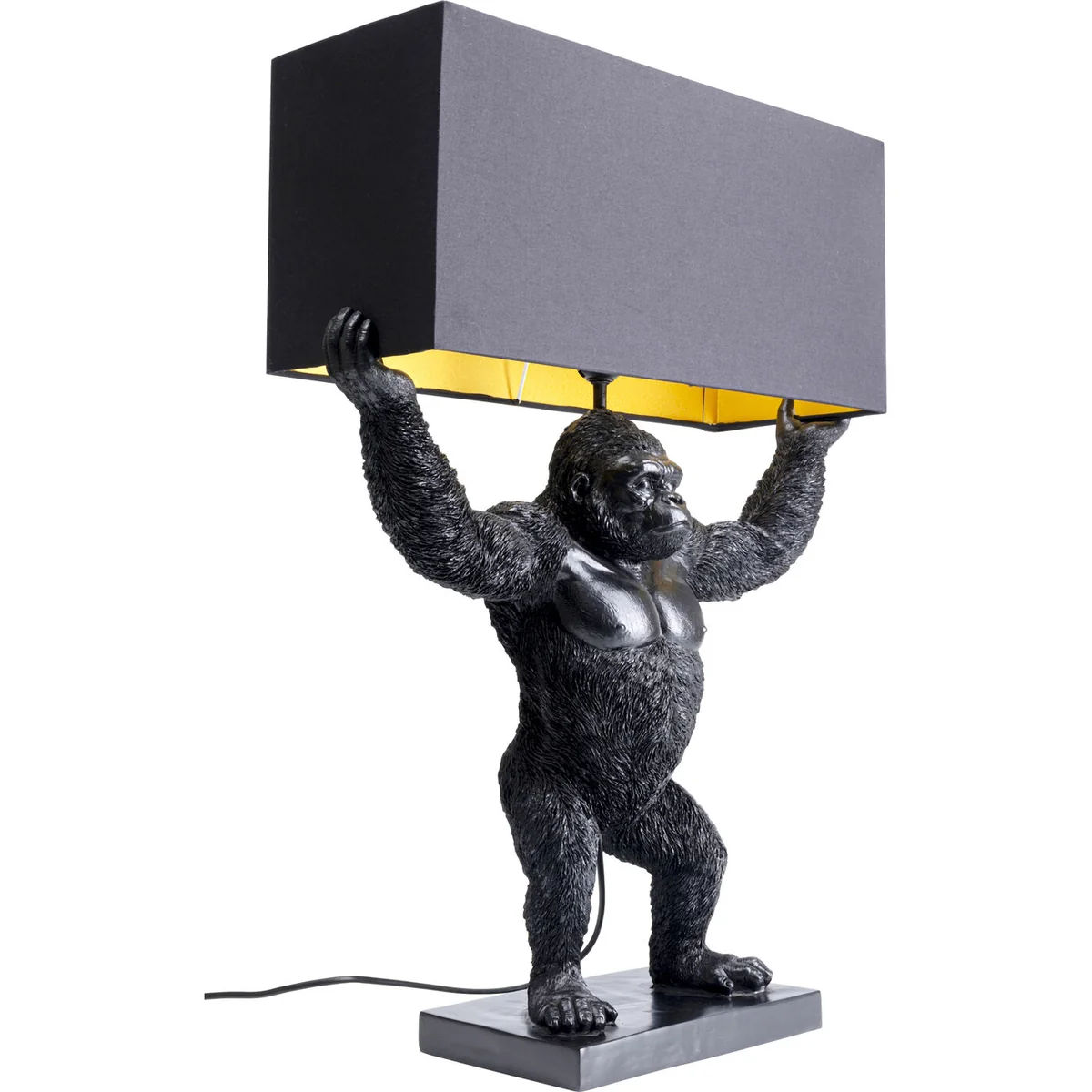 - Unusual lamp featuring a gorilla as a real attention-getter - Rectangular lampshade made of cotton, gold-coloured inside for pleasantly warm light - King Kong looks good with his impact-making pose, as do you thanks to the original decorating idea - The ideal table lamp for a large sideboard - Faithfully handcrafted in detail, slight deviations from the illustration are possible