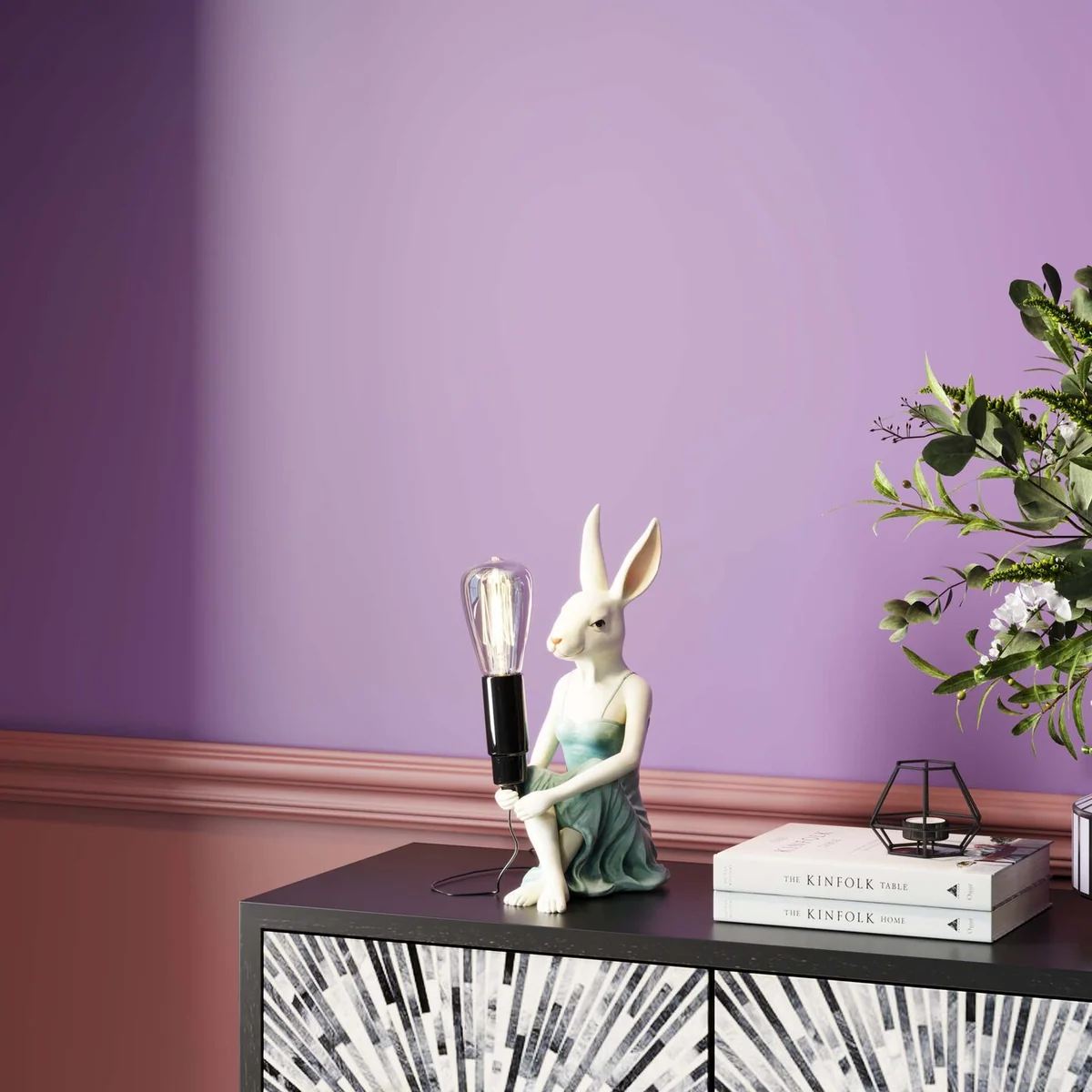 Key features of this lamp include a compact size of 21cm, perfect for small desks or bedside tables. It's crafted from durable laquered polyresin, ensuring longevity and resistance to wear and tear. The lamp's unique design, featuring a playful girl rabbit, adds a touch of whimsy and charm to any room.