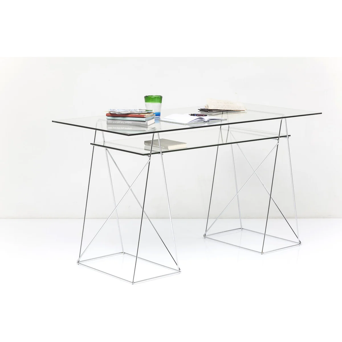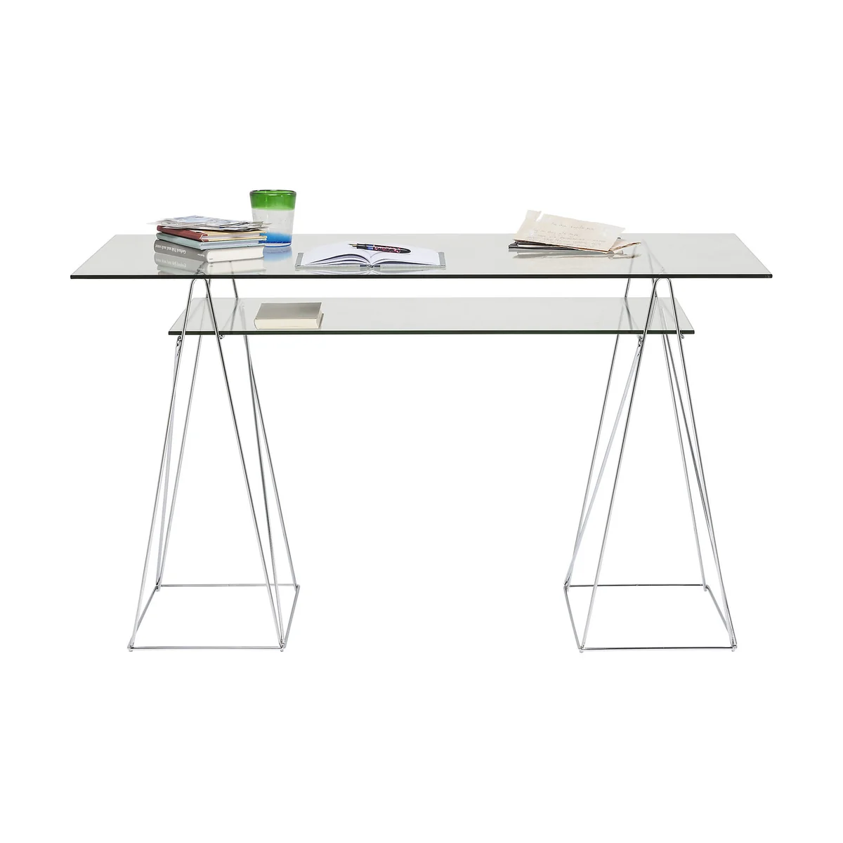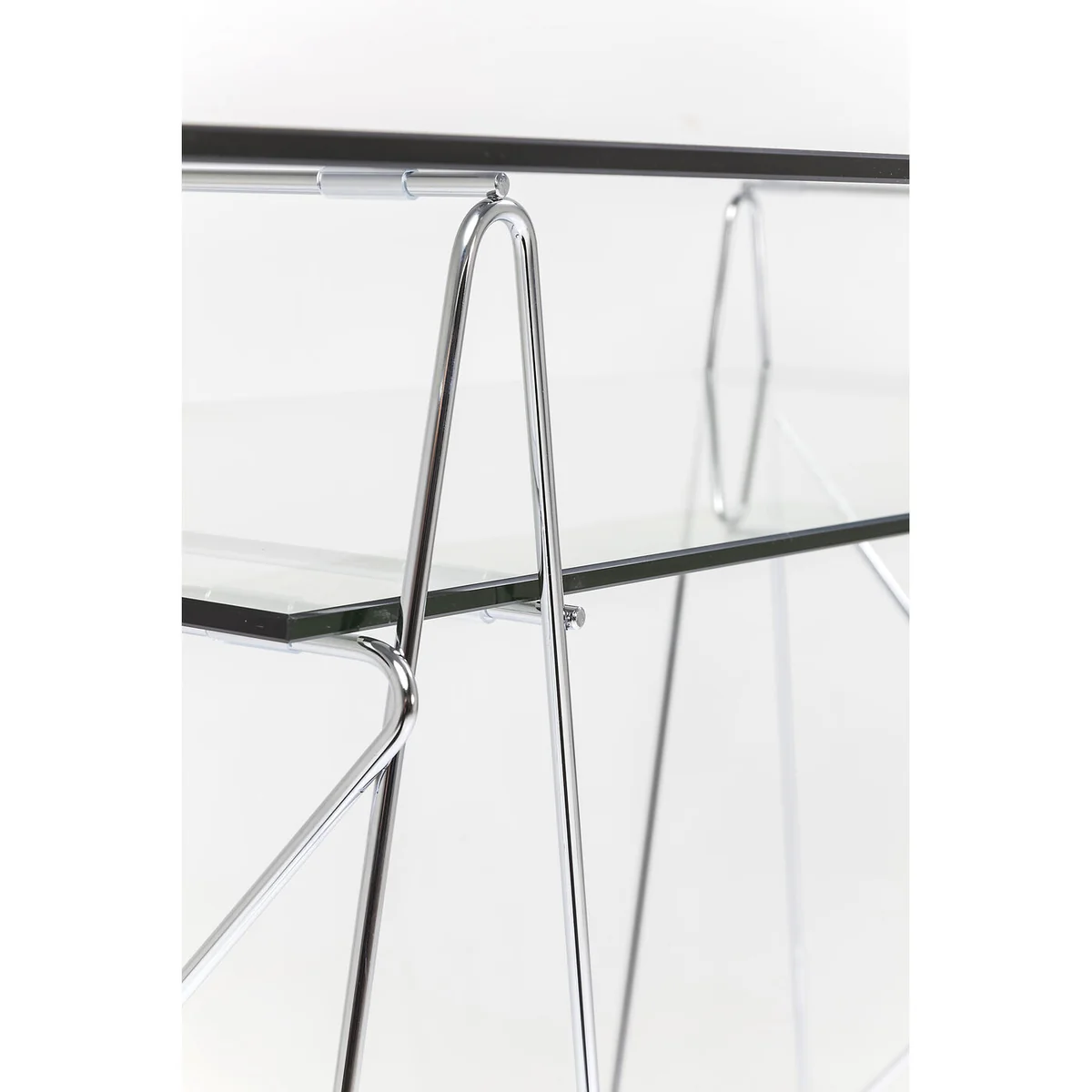 • An eye-catcher for the home office: a glass desk with filigree, chrome frame • Perfectly organised: two glass tops arranged one above the other offer space for working, filing and keeping things tidy • Glass and chrome: the light, easy-care and timeless materials go ideally with a minimalist and modern furnishing style • Filigree look: two cleverly designed frames made of steel serve as supports for the clear glass tops • Safety first: the sturdy, 8 mm thick ESG safety glass is characterised by its special impact and shock resistance