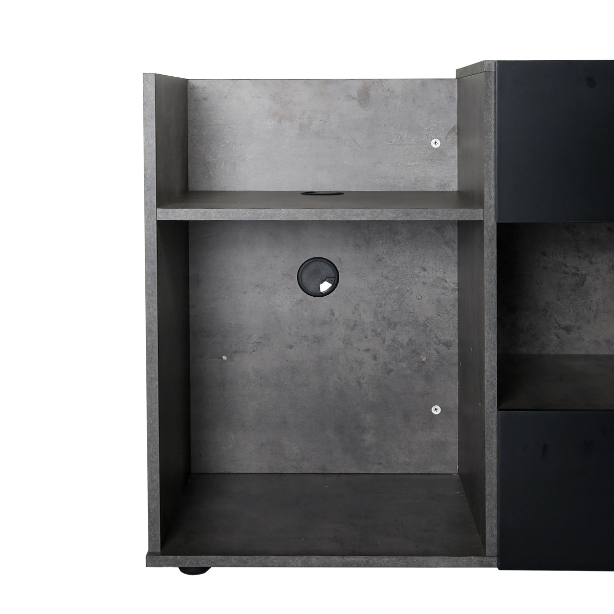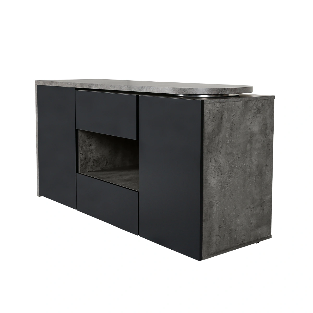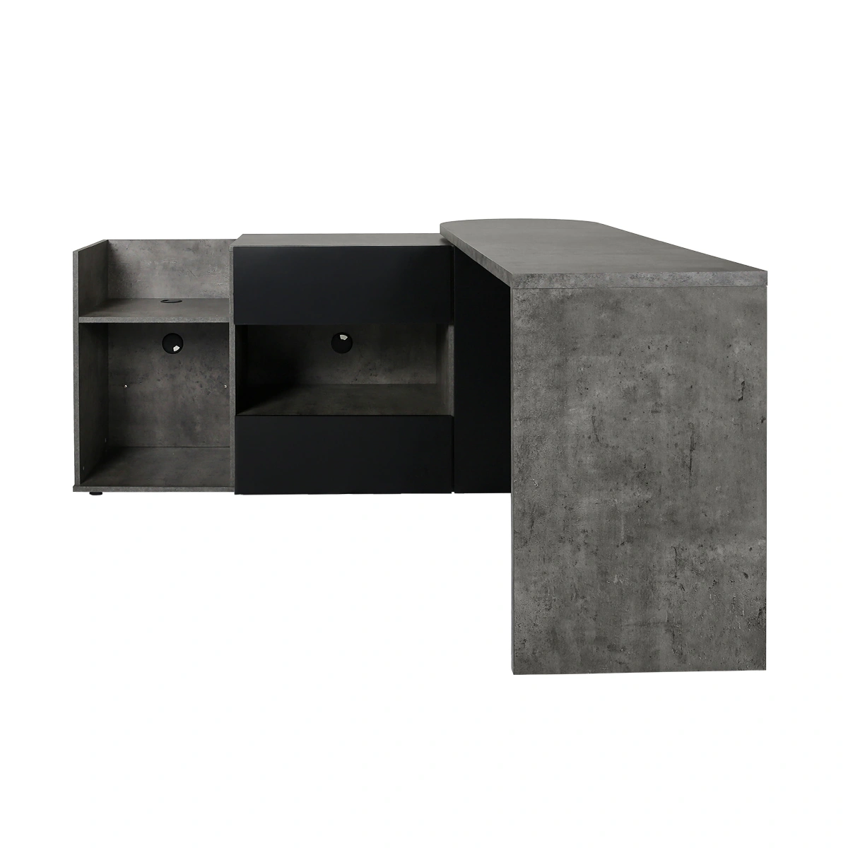 Key features of the desk include a spacious top made from chipboard covered with melamine, providing a durable concrete look. The structure is also made from chipboard, while the door, drawers, and front panel are made from MDF lacquered in matte black. Its dimensions are 76 cm in length, 159 cm in depth, and 48 cm in height.