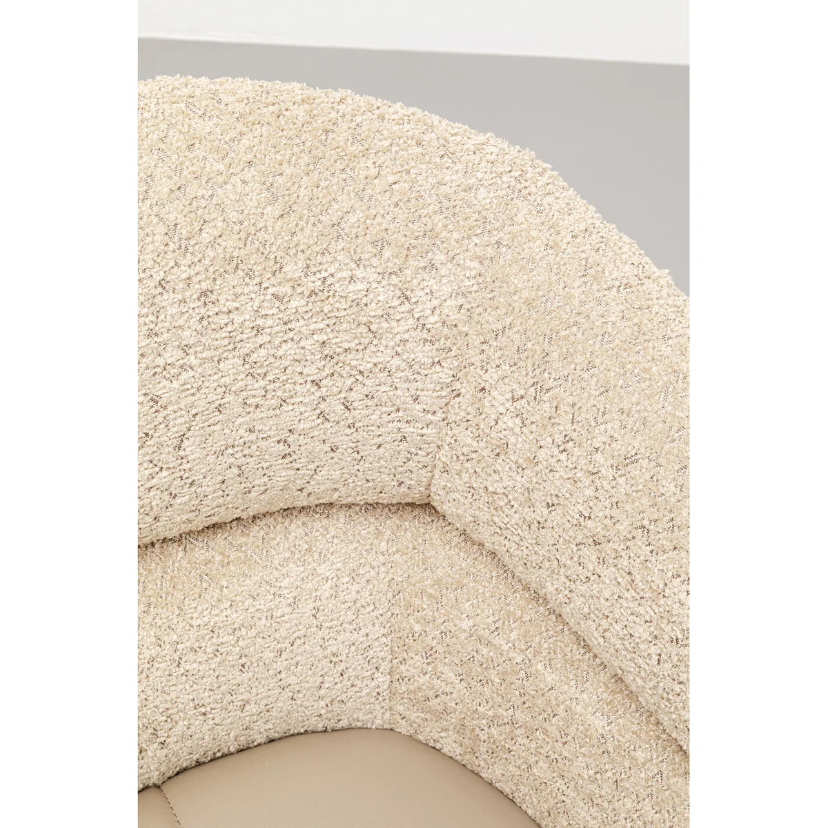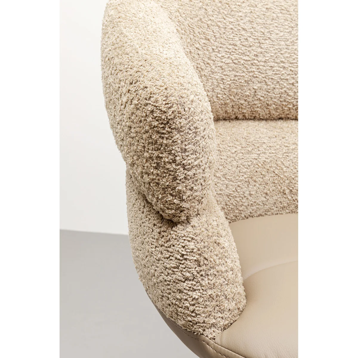 Key features of this chair include its organically shaped seat shell with integrated armrests, a stylishly modern color scheme, and robust craftsmanship. Size: 81.5 x 63 x 61 centimeters (H/W/D). The chair stands out with its soft bouclé and leather-look seat, creating a harmonious and modern aesthetic. Plus, its 360° swivel function ensures maximum mobility.
