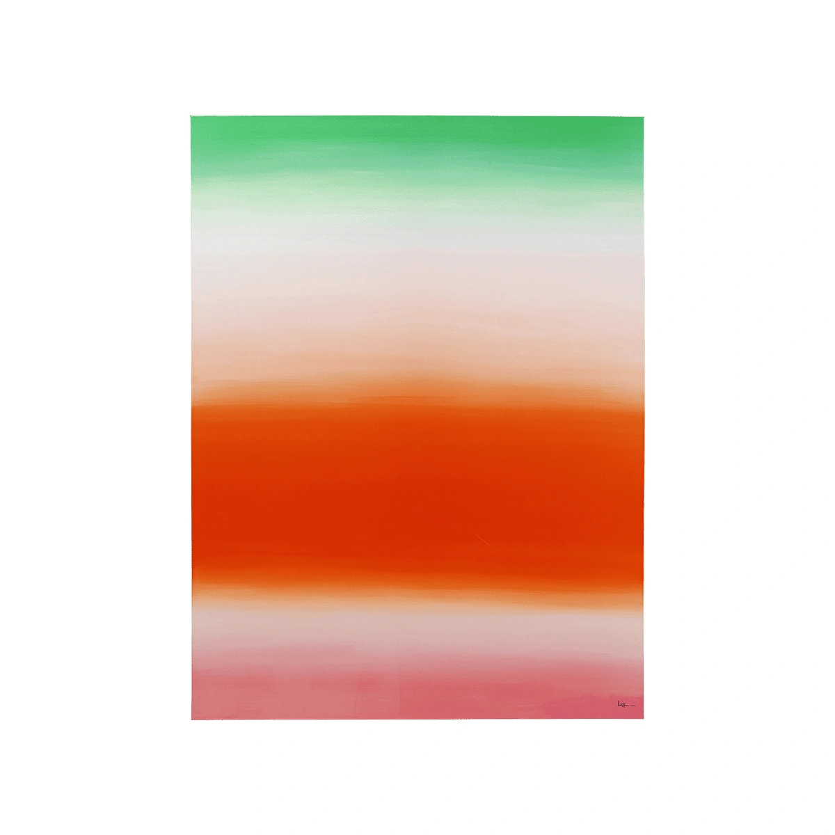 This large canvas picture showcases a color gradient in green and orange, measuring 160 x 120 x 3.5 centimeters. Its flowing gradients and harmonious, vibrant colors lend the artwork a dynamic depth. The canvas is made of cotton and coated with polyresin, creating a modern high-gloss finish.