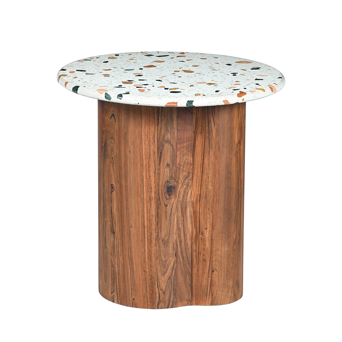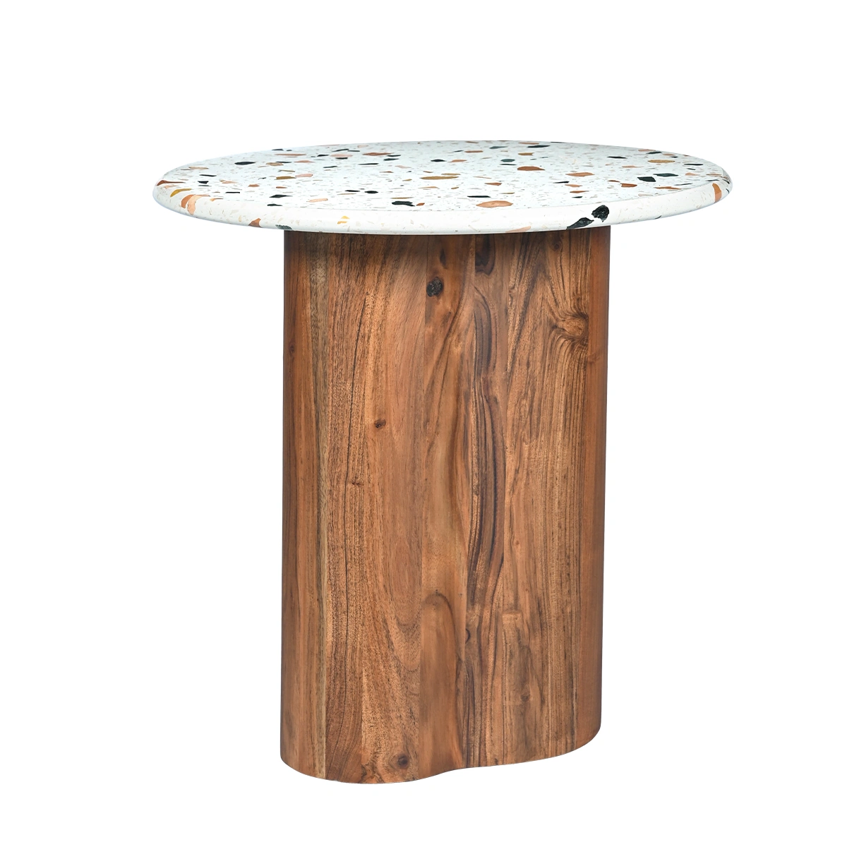 Featuring a terrazzo top with a solid ash wood base, it combines durability with artistic style. Dimensions: L 45 cm, W 45 cm, H 45 cm.