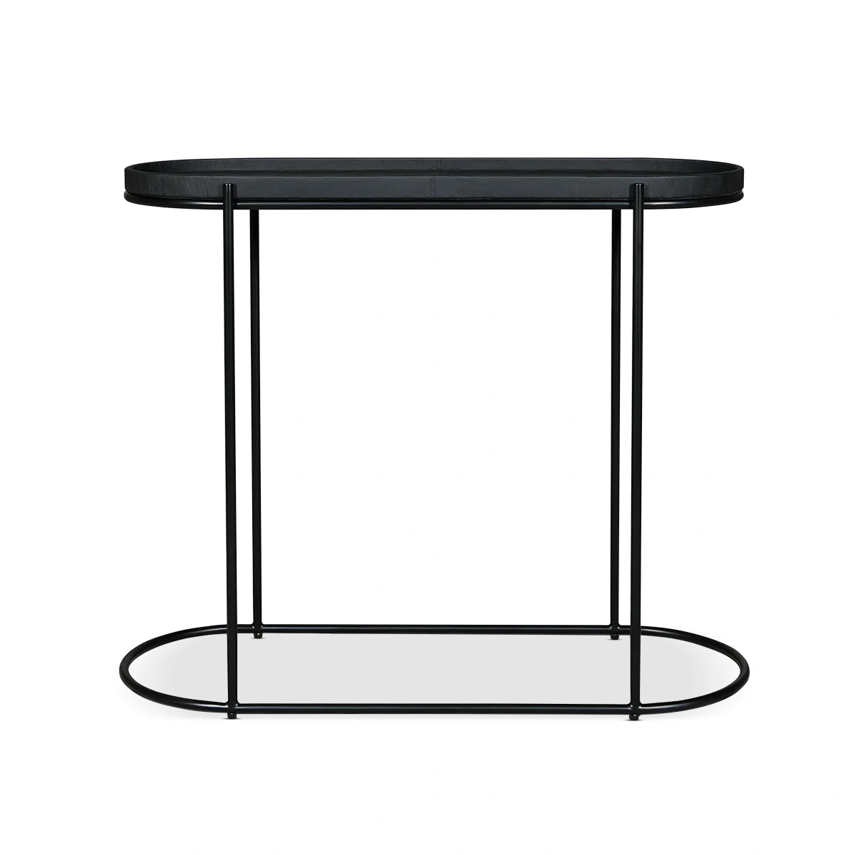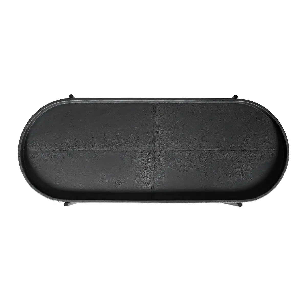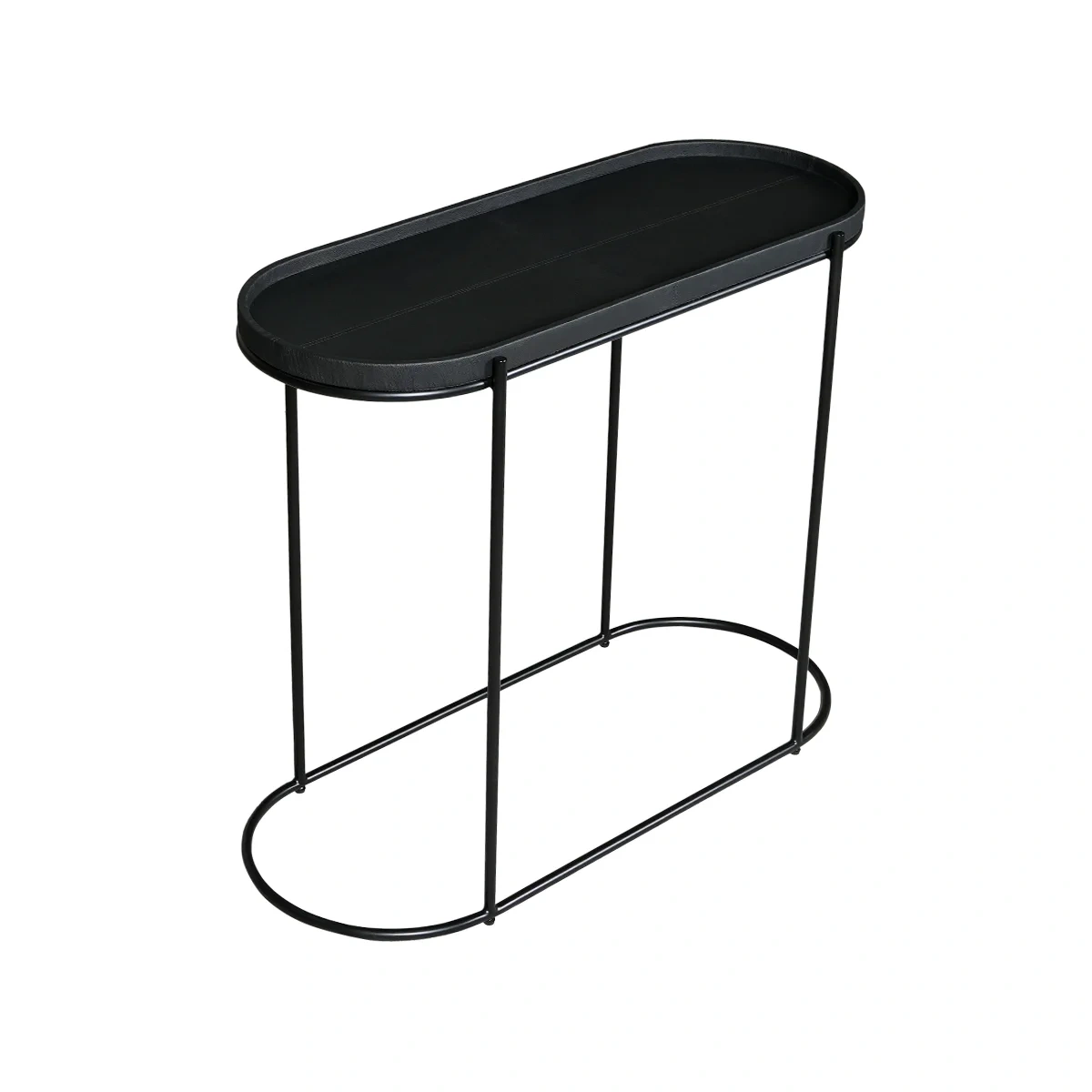 The Top Console Leather Tray features a black leather tray surface supported by a clean iron frame. Its slim profile makes it a practical and stylish choice for entryways or behind sofas.