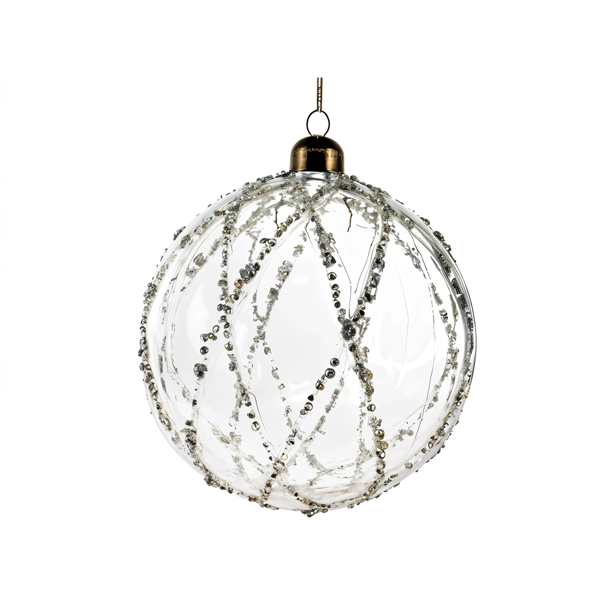 The Transparent Glass Ball with Silver Diamonds in Clear blends elegance and sparkle. Its crystal-like finish and silver embellishments make it an exquisite addition that enhances both classic and contemporary décor.