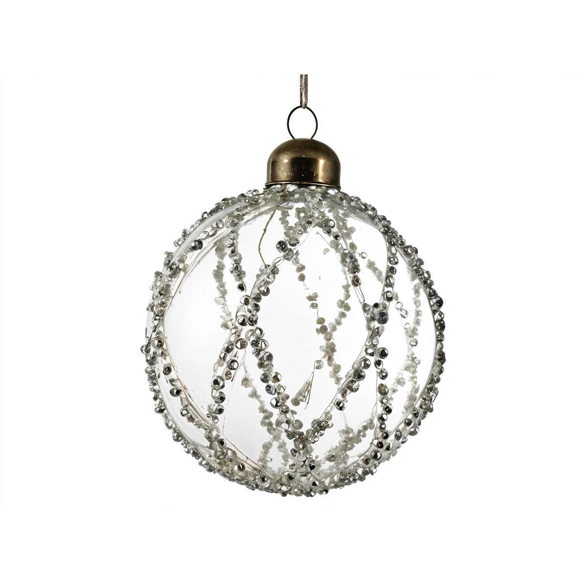 This decorative piece, measuring 8cm in diameter, is made from high-quality glass and adorned with silver diamonds. Its small size makes it versatile, while its clear, transparent appeal lends a touch of sophistication. The gleaming silver diamonds add depth and contrast, creating a captivating aesthetic.