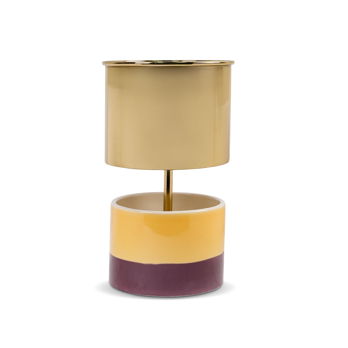Featuring a geometric design, the vase stands at 16 cm tall and measures 31 cm in width and length. The metallic top floats above the stacked ceramic base, offering a striking contrast that catches the eye. The rich, layered colors lend depth and dimension to the vase, making it a standout accessory.