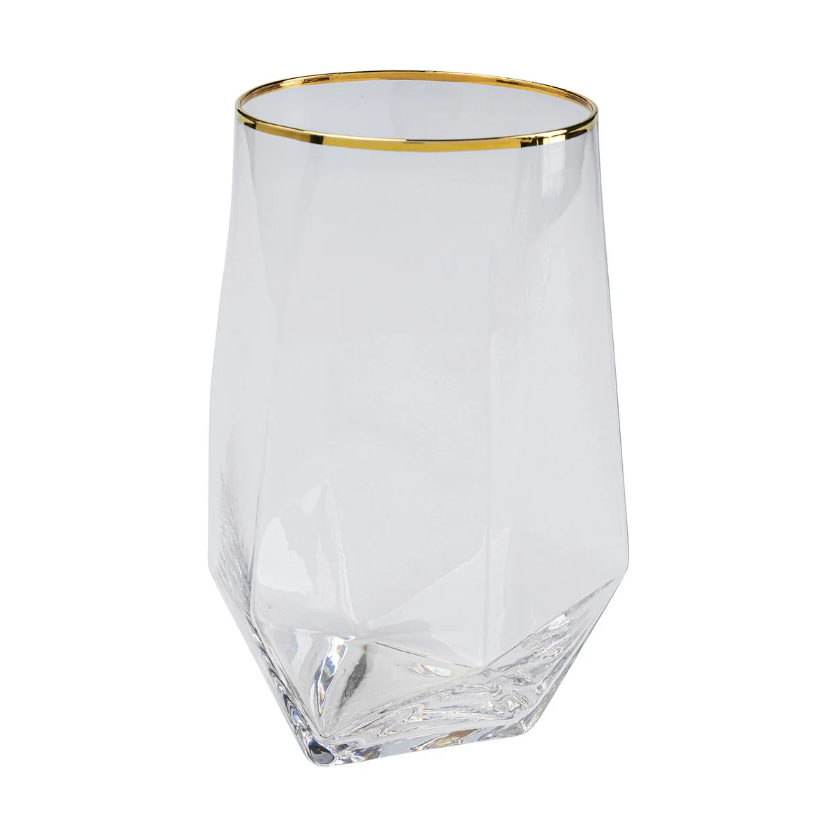 • Modern water glass with golden rim, 15 x 5 x 8 centimeters (h/w/d) • The modern drinking glass impresses with its clear, geometric shapes and edges • The shiny, delicate gold rim gives the glass an elegant and luxurious touch that enhances any drink • Ideal for special occasions or everyday use, the glass brings a touch of luxury to any table setting • With a generous capacity of 510 ml, the glass is ideal for refreshing drinks or large portions of water