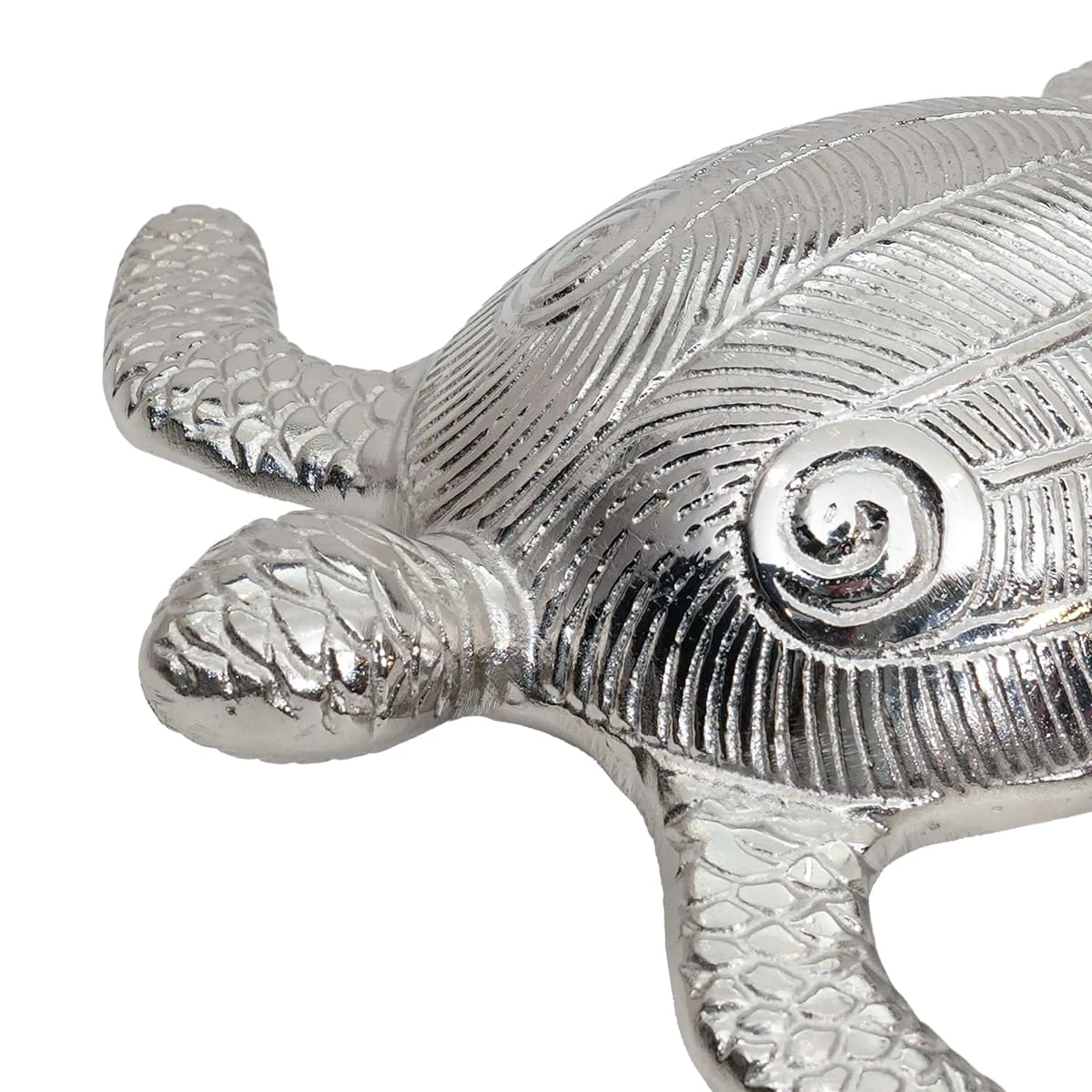 The key features of this Turtle Figurine 2 include its raw silver finish and sturdy aluminium base, providing a durable and stylish home accessory. With dimensions of 24cm by 24cm by 7cm, it is perfect for living spaces or display corners.