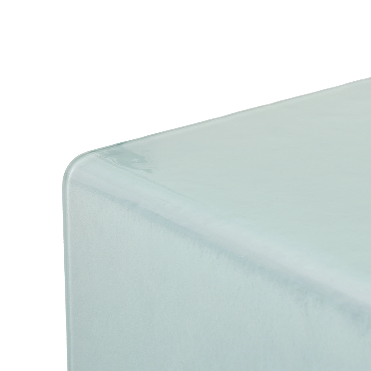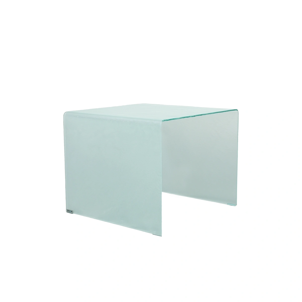 Boasting a unique curved form, this lamp table measures 60 cm in length, 60 cm in depth, and 50 cm in height. The transparent satin glass, fired on a curved cloth, provides an ethereal quality, making it ideal for displaying a lamp, book, or decorative piece.