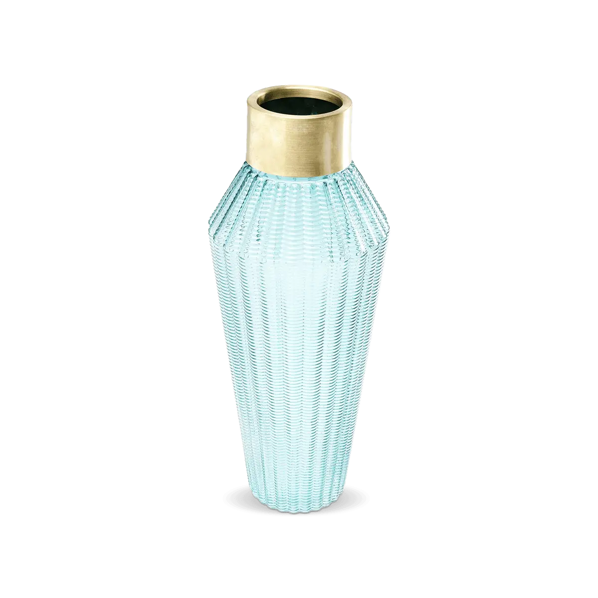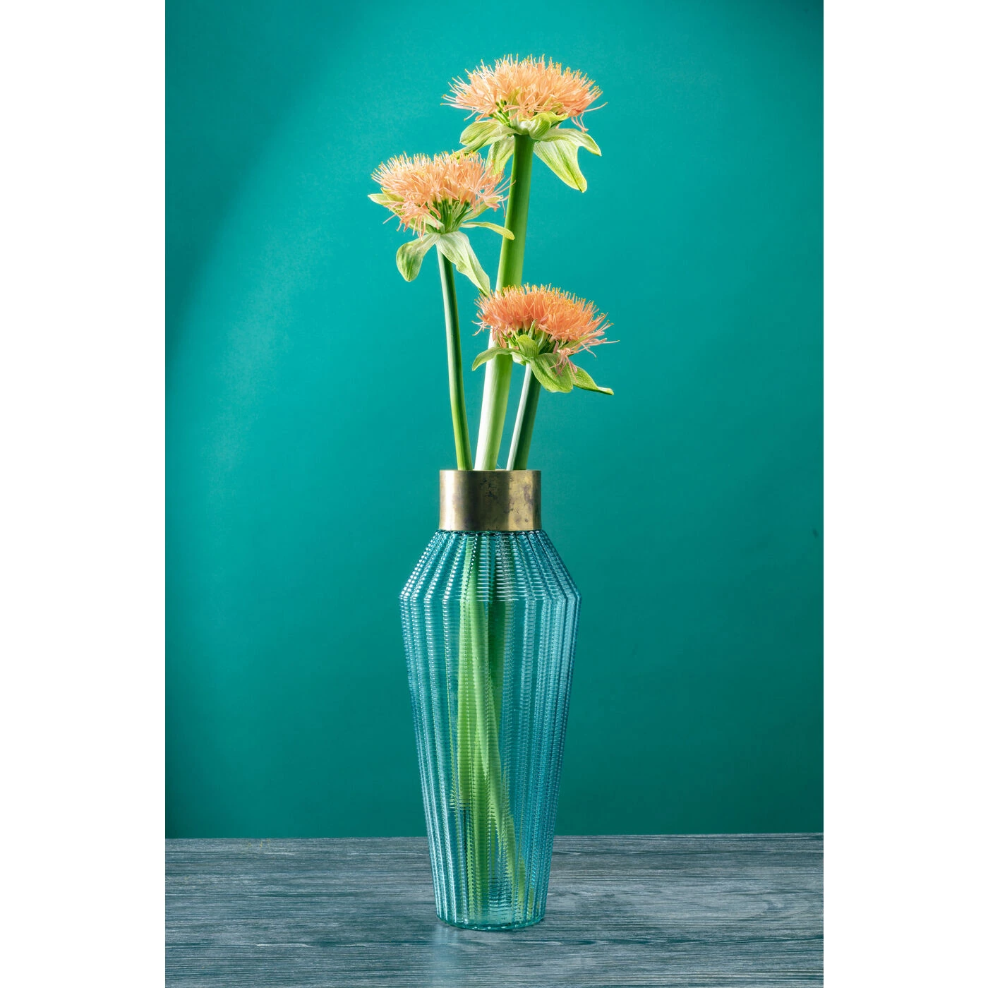 Vase in blue: a vase series with that certain something The Barfly series plays with gentle pastel colours, versatile shapes and solid glass with different designs. The coloured glass and the unusual shapes of the vases are reminiscent of artistic glass from Murano, while the neck of the vase is decorated by a gleaming ring of brass. Ideal for romantic decorations, a great match for the retro style, and forms a spectacular contrast on a modern sideboard. Choose your favourite colour and shape from our highly diverse range!