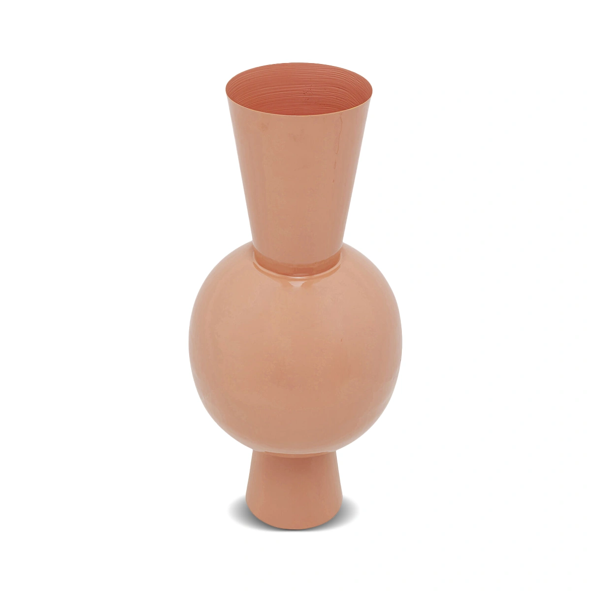 The Blow vase in peach is a large decorative glass vase designed to make a bold statement in contemporary interiors. Its organic blown form and soft peach tone create visual drama while maintaining refined elegance in living spaces. Combining glass with enameled steel detailing, this vase features a sculptural silhouette and smooth finish. Its generous scale makes it ideal as a standalone decorative piece or for showcasing large floral arrangements.