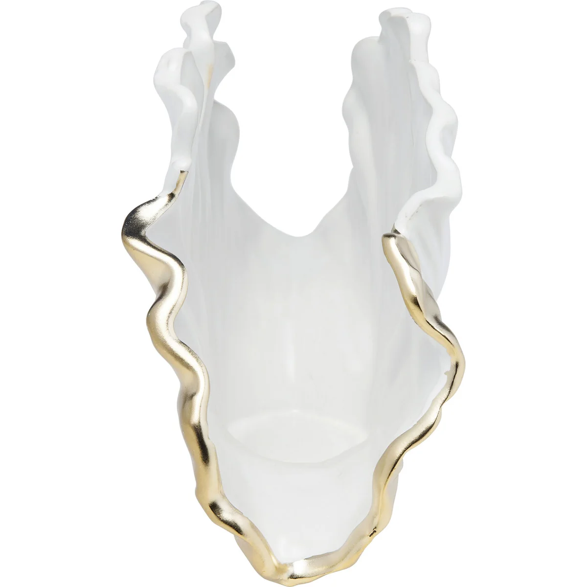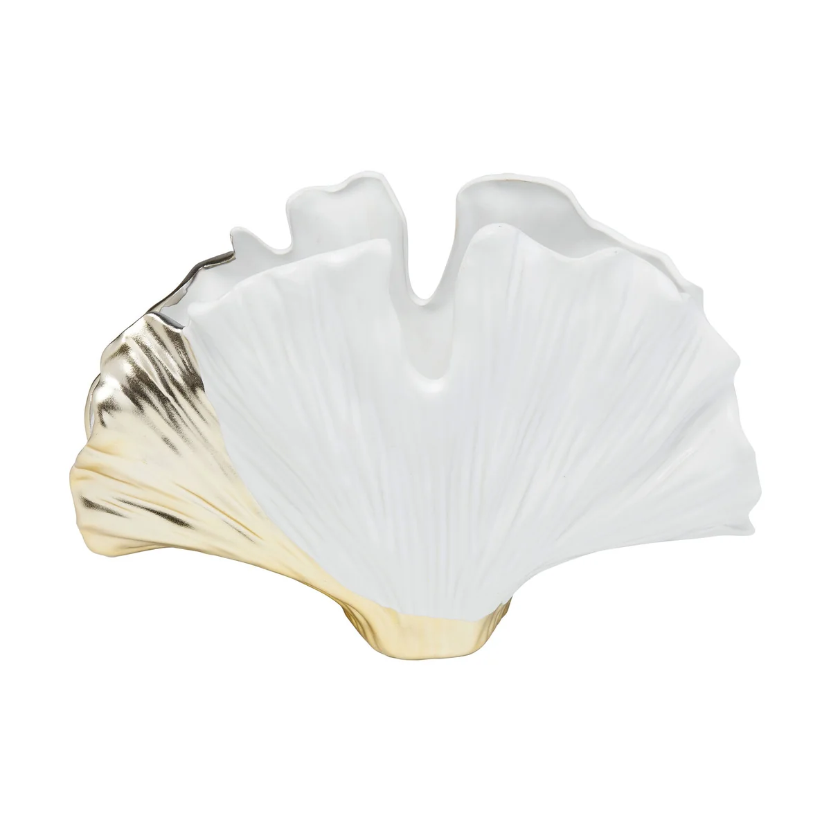 • Elegant vase in ginkgo leaf design in white and gold, 17.5 x 25.5 x 8.5 centimeters (H/W/D) • This sculptural vase adds a touch of glamor with its delicate silhouette and fine golden details • The ginkgo is not only considered a tree of happiness, the filigree lines of its leaves are uniquely beautiful • Perfect as a single statement piece or in combination with other home accessories for a harmonious ambience • Made from high-quality ceramic