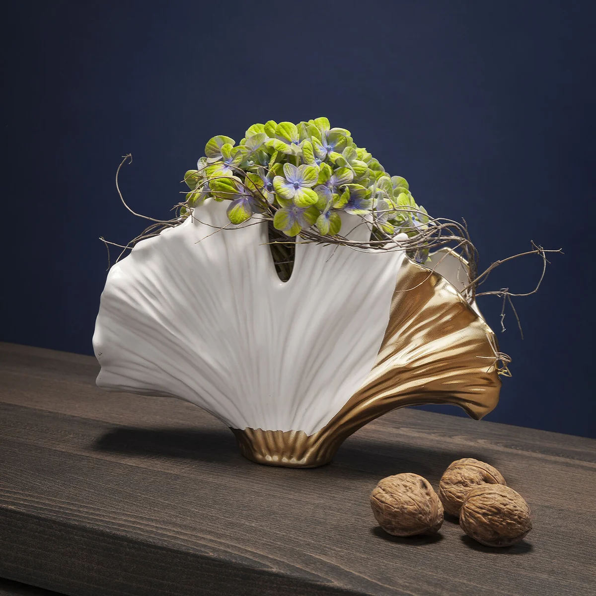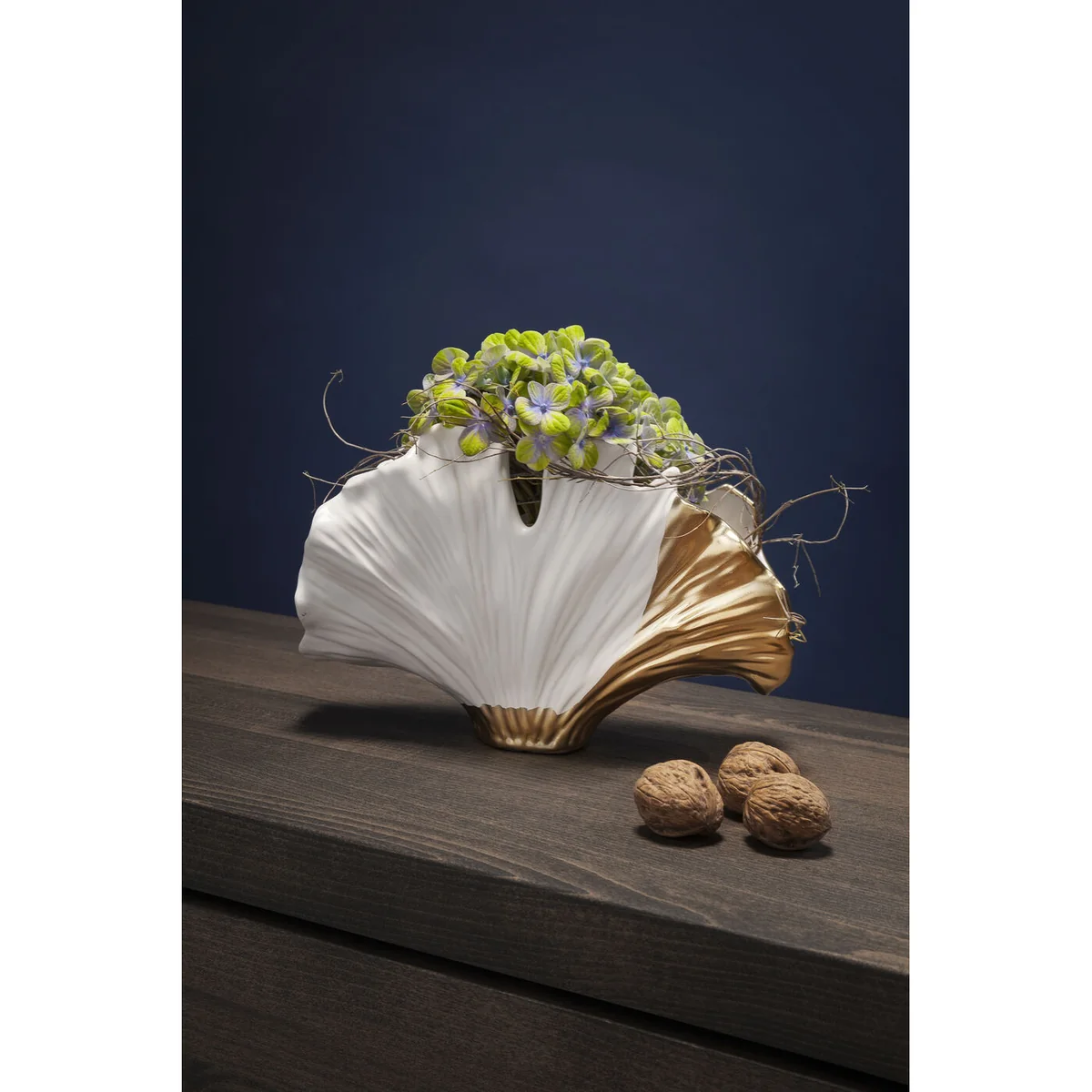 A tribute to nature with a luxurious twist - this vase in a ginkgo leaf design combines organic elegance with a sophisticated shine. The gentle, curved shape meets golden accents that give the object a sculptural appearance. As a stylish individual piece, it creates subtle highlights on a chest of drawers, windowsill or side table. In combination with other accessories in cream, gold or natural tones, it creates a harmonious overall look with Asian-inspired lightness. Made from high-quality ceramic, this decorative object combines symbolic depth with timeless style - a small work of art with a big impact.