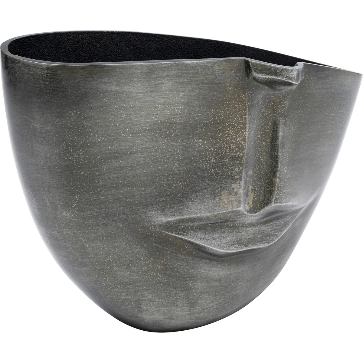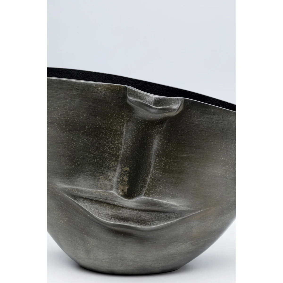 • Grey vase in the shape of a bowl made of metal, sized 31 x 22 x 11 cm (H/W/D) • It gives every bouquet of flowers a face with its design • This flower vase puts two decorative trends on your sideboard at the same time: face design and decorative vases made of metal • Each large vase is a unique handcrafted piece • As a decorative bowl on the chest of drawers it provides interesting storage for keys and the like