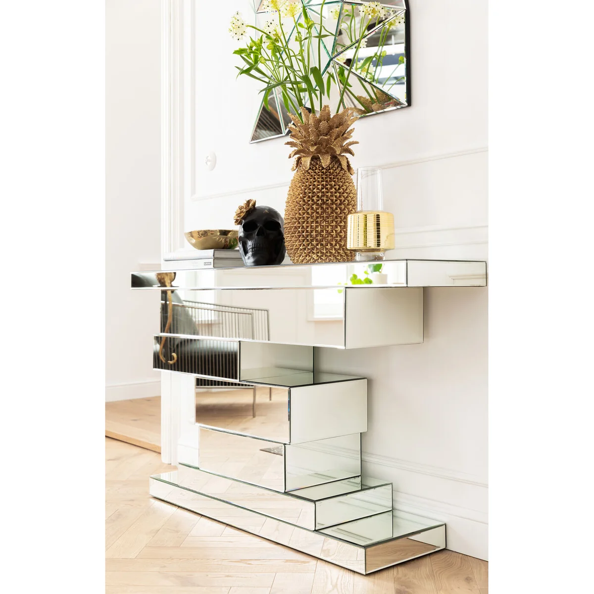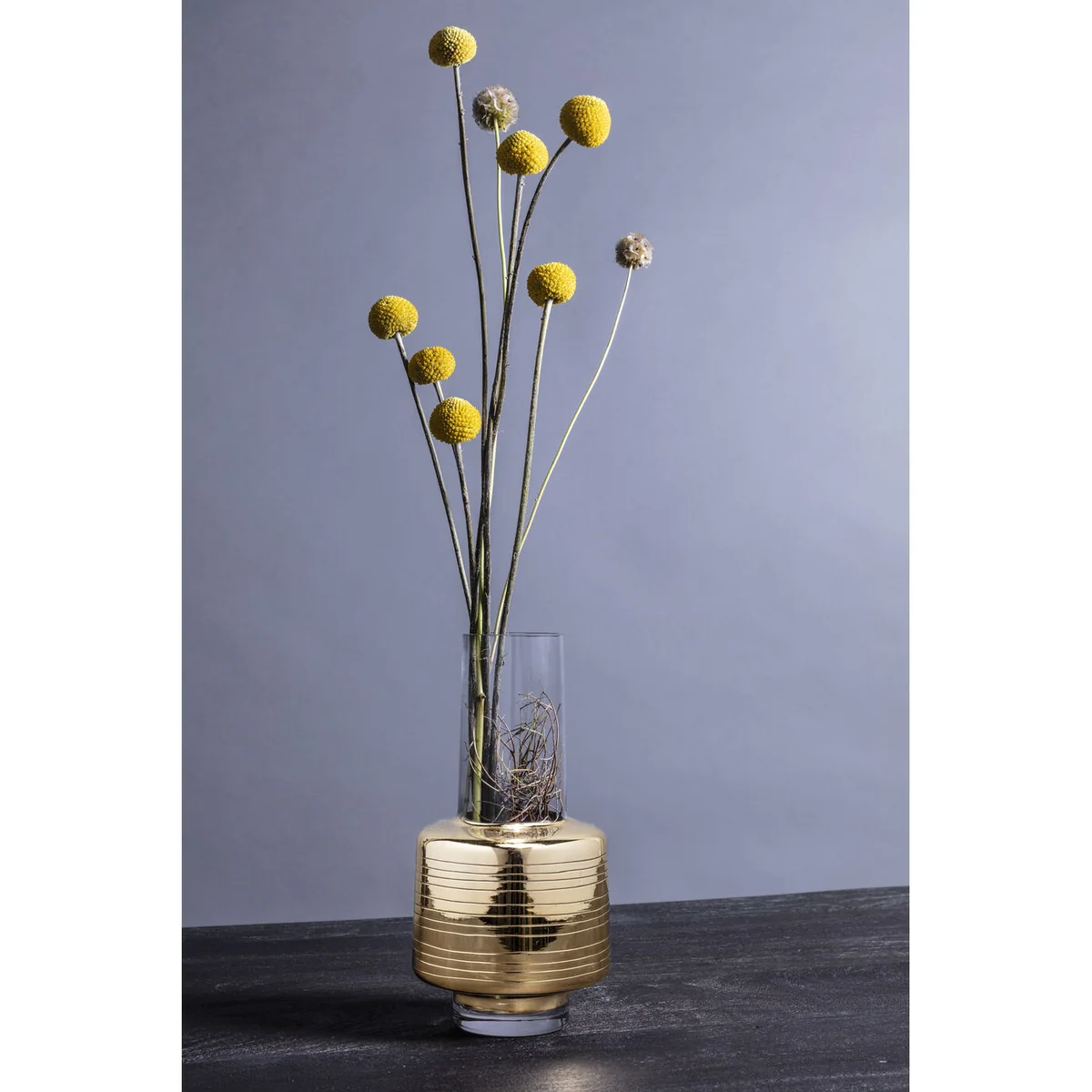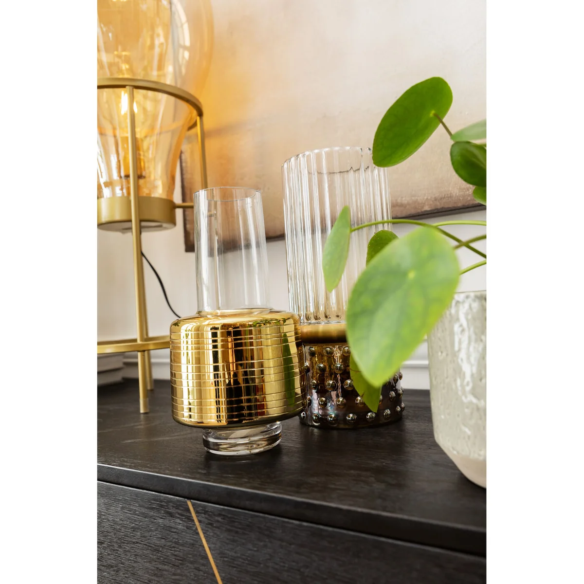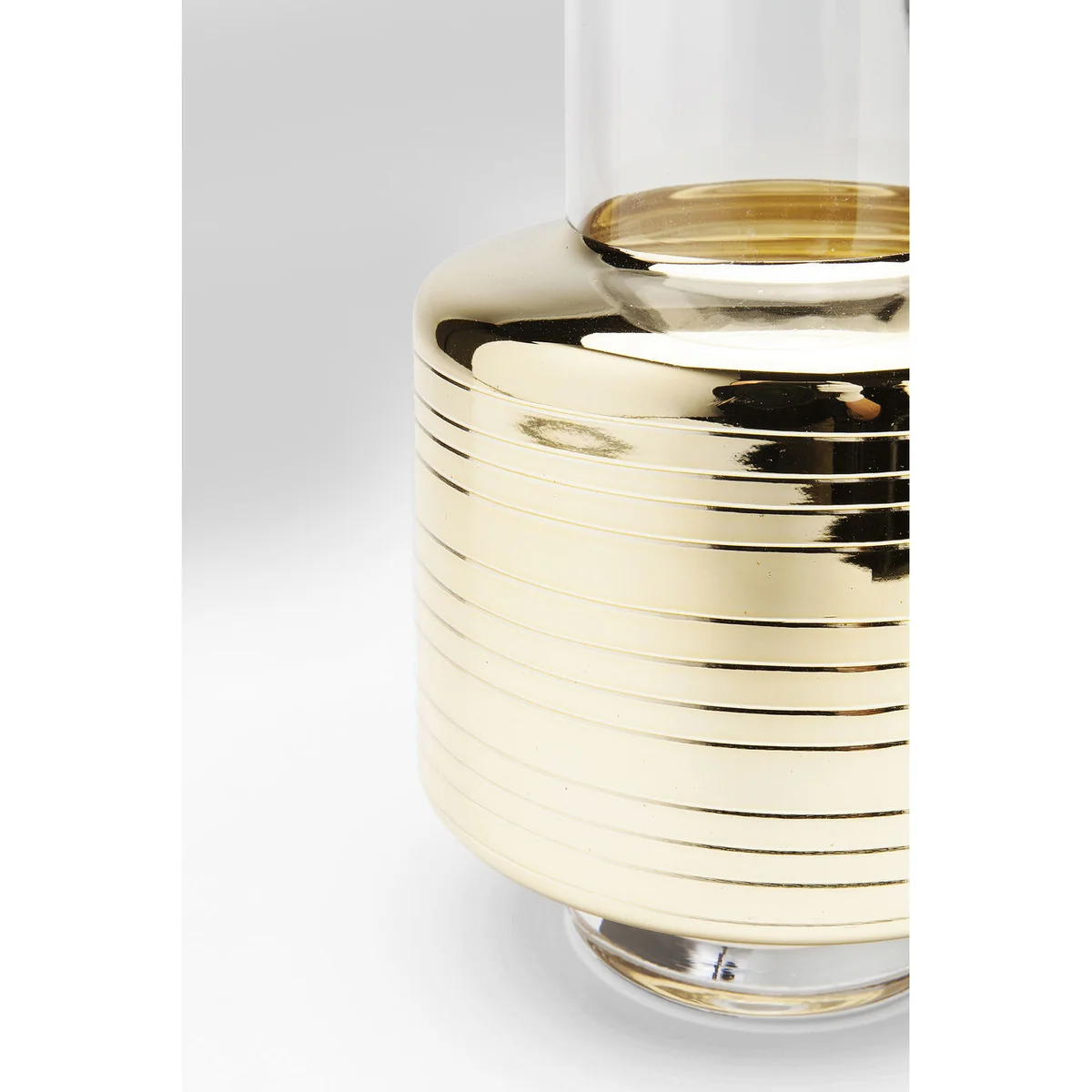 - A slim, tall vase in an exciting design mix of glass and gold-coloured highlights. - Brings out the best in full-bodied flower beauties such as peonies, ranunculus and dahlias. - Entirely in the style of soft glamour: attracts attention with its flamboyance, but doesn't show off. - The gold band will enhance any bouquet. - This vase will make a real impact as a dinner party gift.