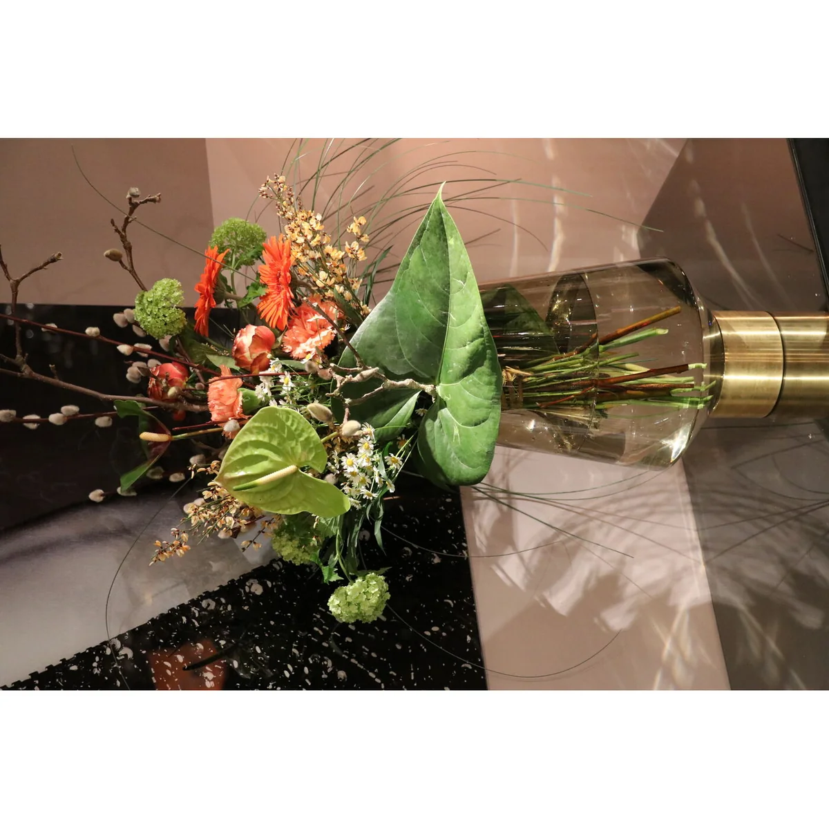 Our vase features a unique ring design, standing at a height of 40cm. It's made from colored glass that gives it a distinctive green hue. With a diameter of 24cm, it's perfectly proportioned to hold your favorite flowers or decorative objects.