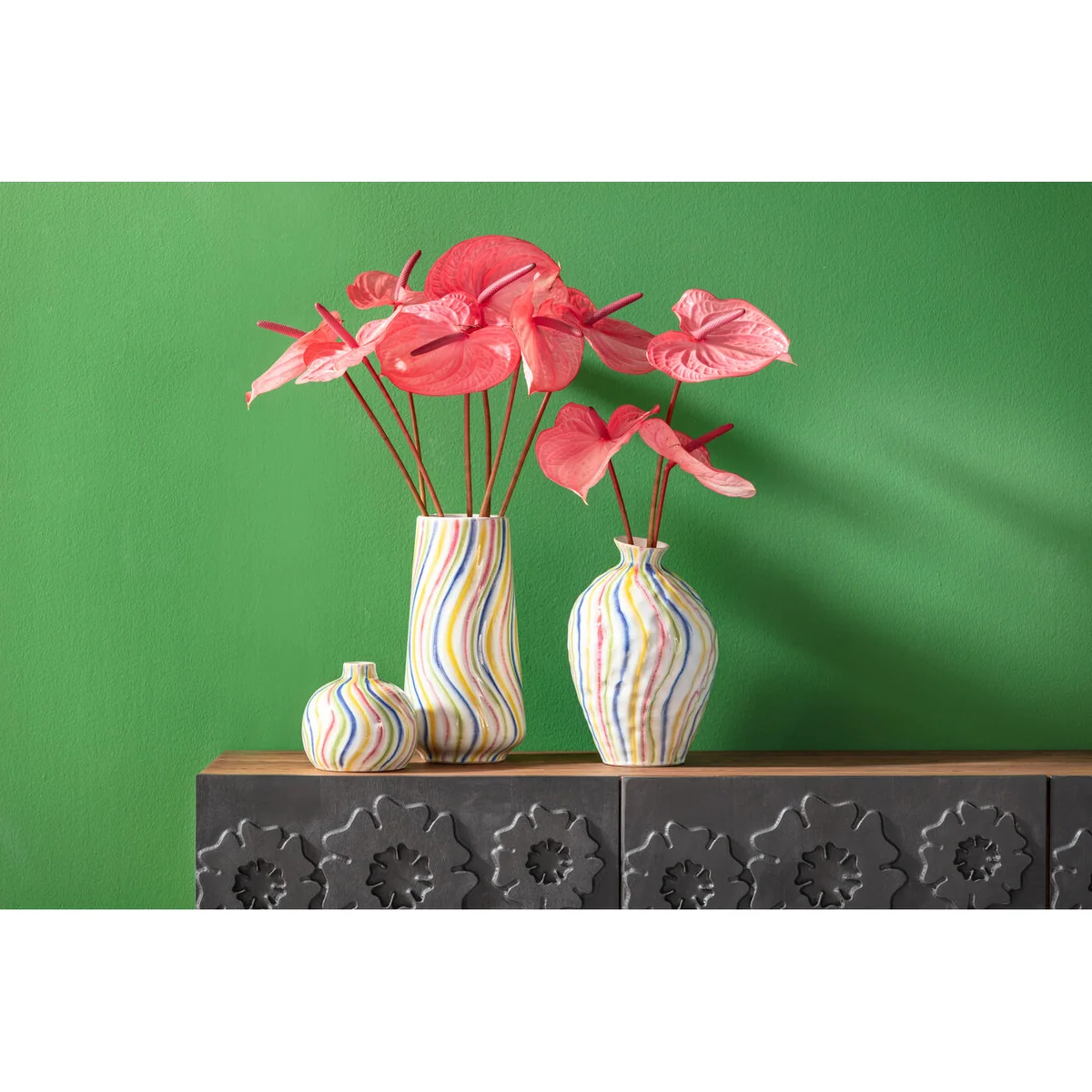 This colorful vase is a true masterpiece of Venetian elegance. Its organic shape and artfully curved silhouette add a luxurious touch to any room. The elegant design is underlined by the harmonious color scheme in bright tones, which can be effortlessly integrated into various living styles. Whether as a solitaire on a sideboard, as an eye-catcher on the dining table or in combination with other decorative objects - this vase sets stylish accents and brings an atmosphere of glamorous sophistication to any home.