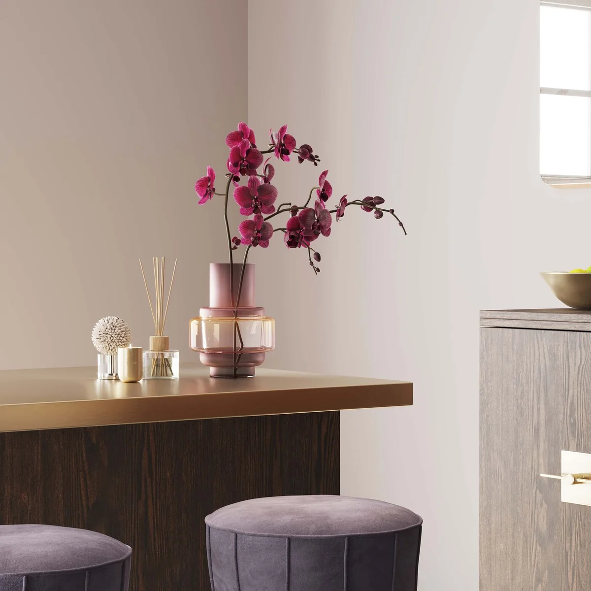 This unusual glass flower vase looks like a modern work of art on the shelf or sideboard, even without flowers. The lilac-golden colouring with its transparent and matt areas looks particularly elegant when combined with brass accessories. Top tip: arrange your coloured glass vases in a group