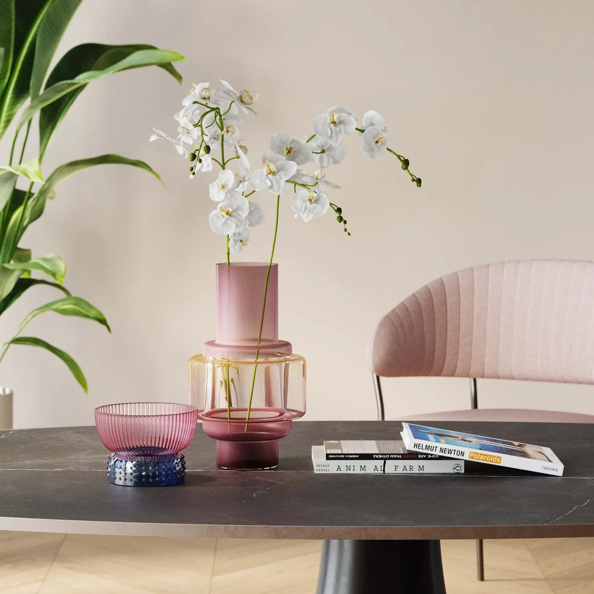 • Impresses with a trendy colour combination in pink and yellow gold • The tall vase beautifully accentuates long-stemmed flowers and grasses • Multicoloured flower vases can be decorated particularly well with brass accessories • The artistic design makes it a beautiful decorative object even without flowers • Top tip: • arrange your coloured glass vases into a group
