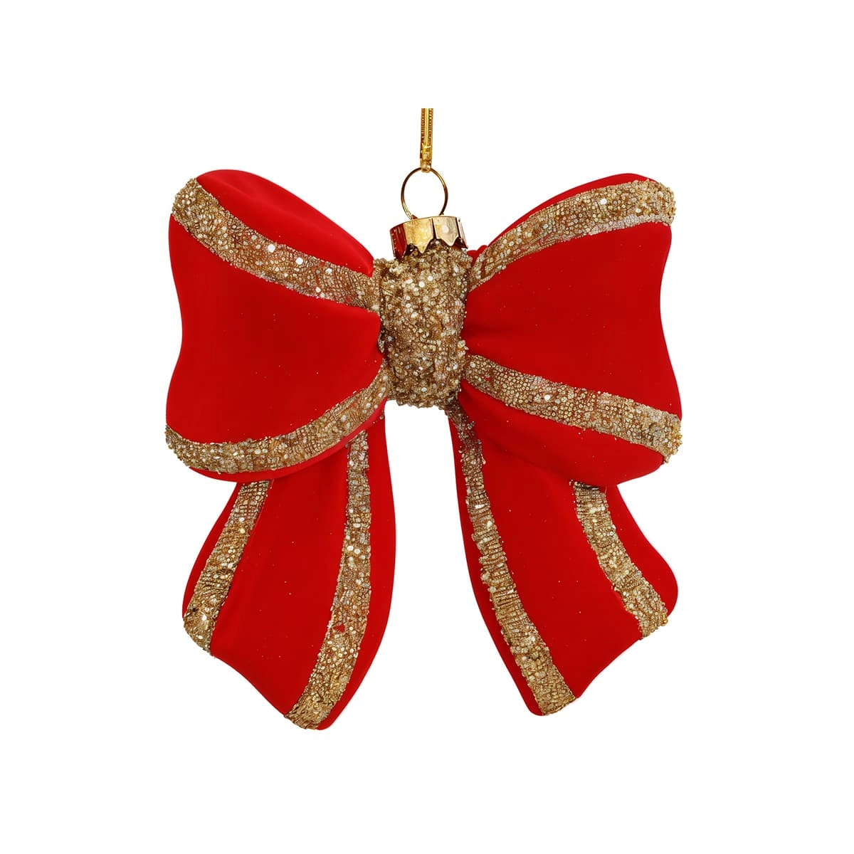 Key features include its plush velvet texture, which offers a soft, luxurious feel, and delicate bead detailing that enhances its visual appeal. The ornament's vibrant red color offers an eye-catching, festive accent that stands out in any setting.