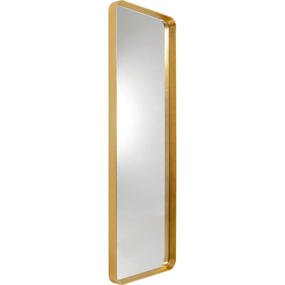 This mirror boasts a generous surface of 203 x 73 x 8 centimeters, capturing the light to create an open, airy effect. The rounded edges and filigree frame in shiny gold enhance its glamorous look, while the durable polyurethane frame assures longevity. It can be hung horizontally or vertically, thanks to the pre-mounted wall hooks.