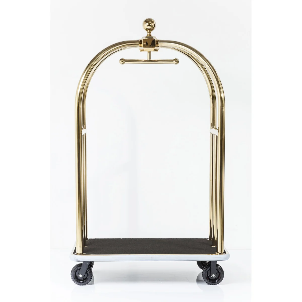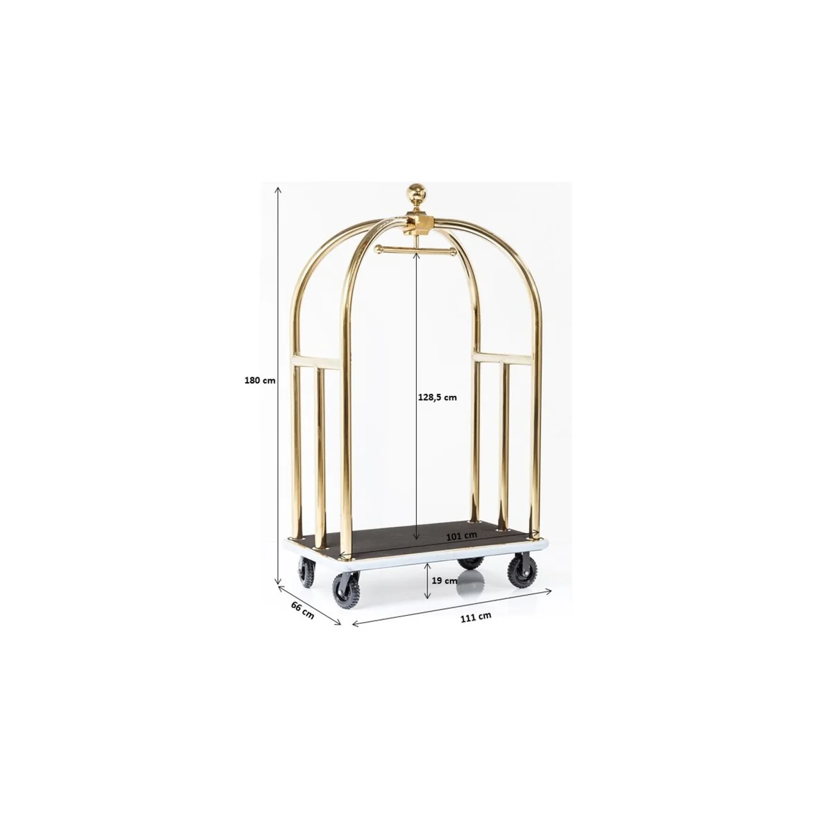 This stylish luggage trolley combines retro chic with glamorous attitude in a successful way. It looks as glamorous in the home as it does in the lobby of a grand hotel. It's also suitable as a wardrobe and a particularly decorative eye-catcher. Four casters provide flexibility and mobility.