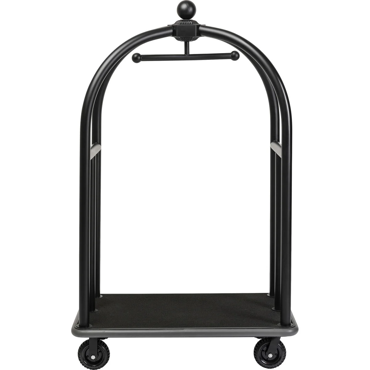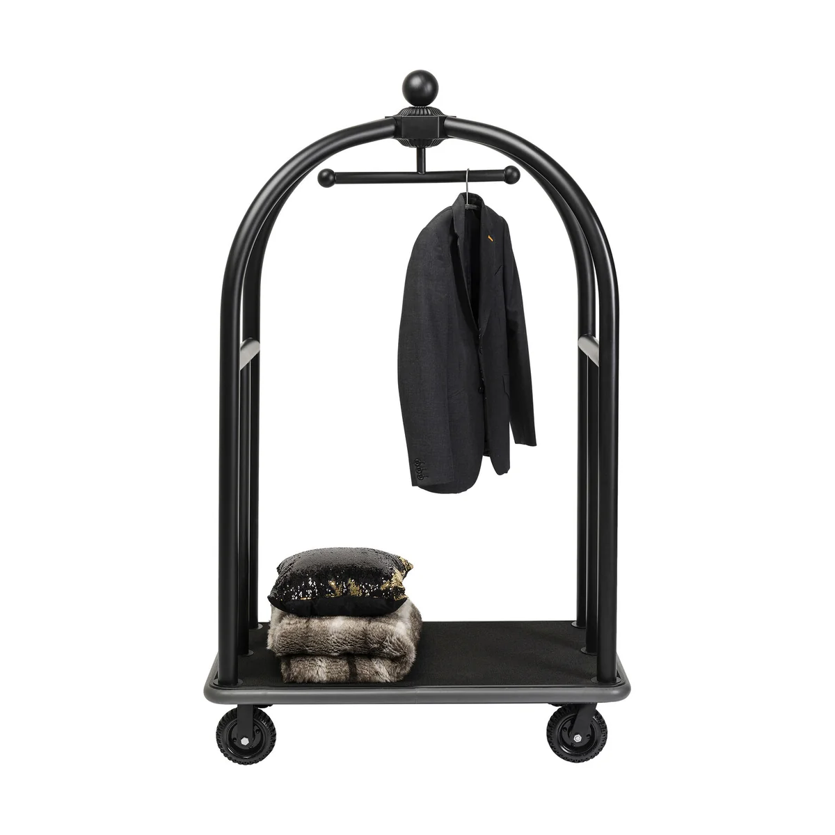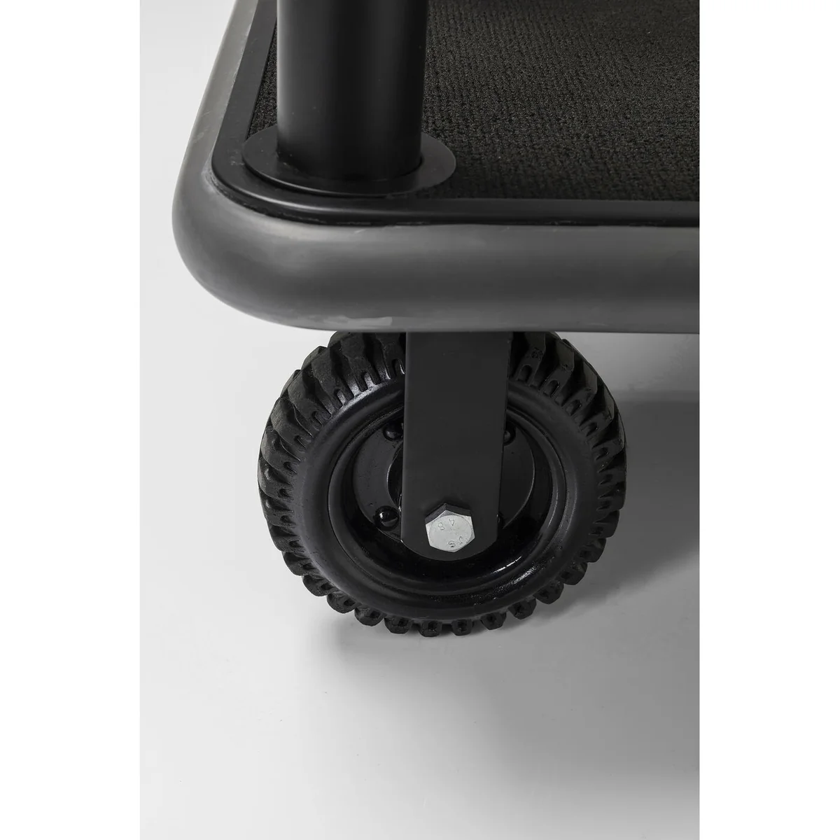 • Flexible applications: a luxurious, matt black luggage trolley on casters in the grand hotel style • The most attractive place to store your beauty case, aluminium suitcase and travel bag in style • Replaces the coat stand in the hallway - surprise your VIP guests! • This mobile piece can be moved from one room to the next at any time, thanks to the floor-protecting rubber casters • Solid and made of powder-coated stainless steel, with practical all-round impact protection made of rubber