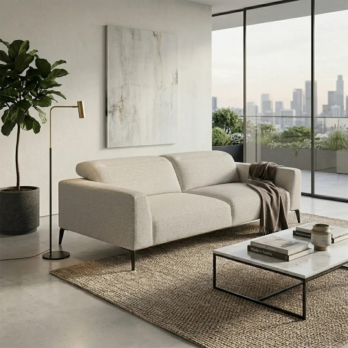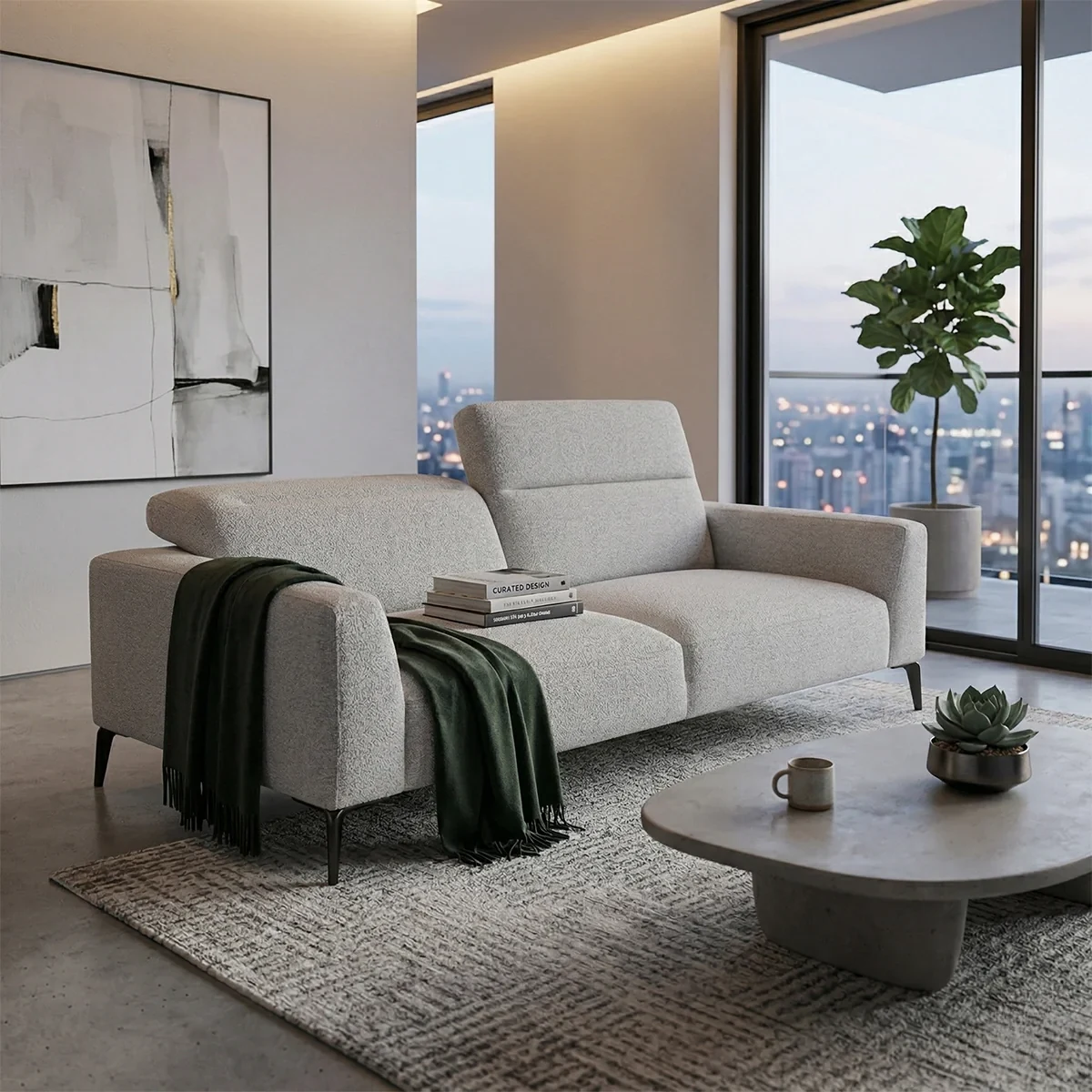 Voluzzi 3 Seater Sofa in Off White pairs seamlessly with the armchair, featuring the same soft fabric, velvet filling, and metal construction. This versatile piece functions as a footrest, small seat, or decorative element, bringing subtle elegance to any room with its understated grey tone.