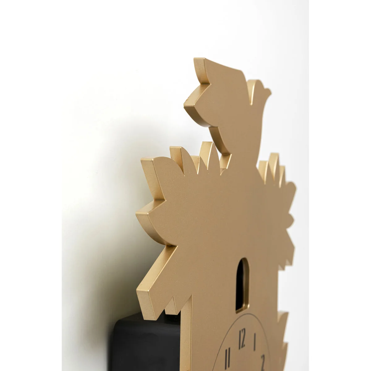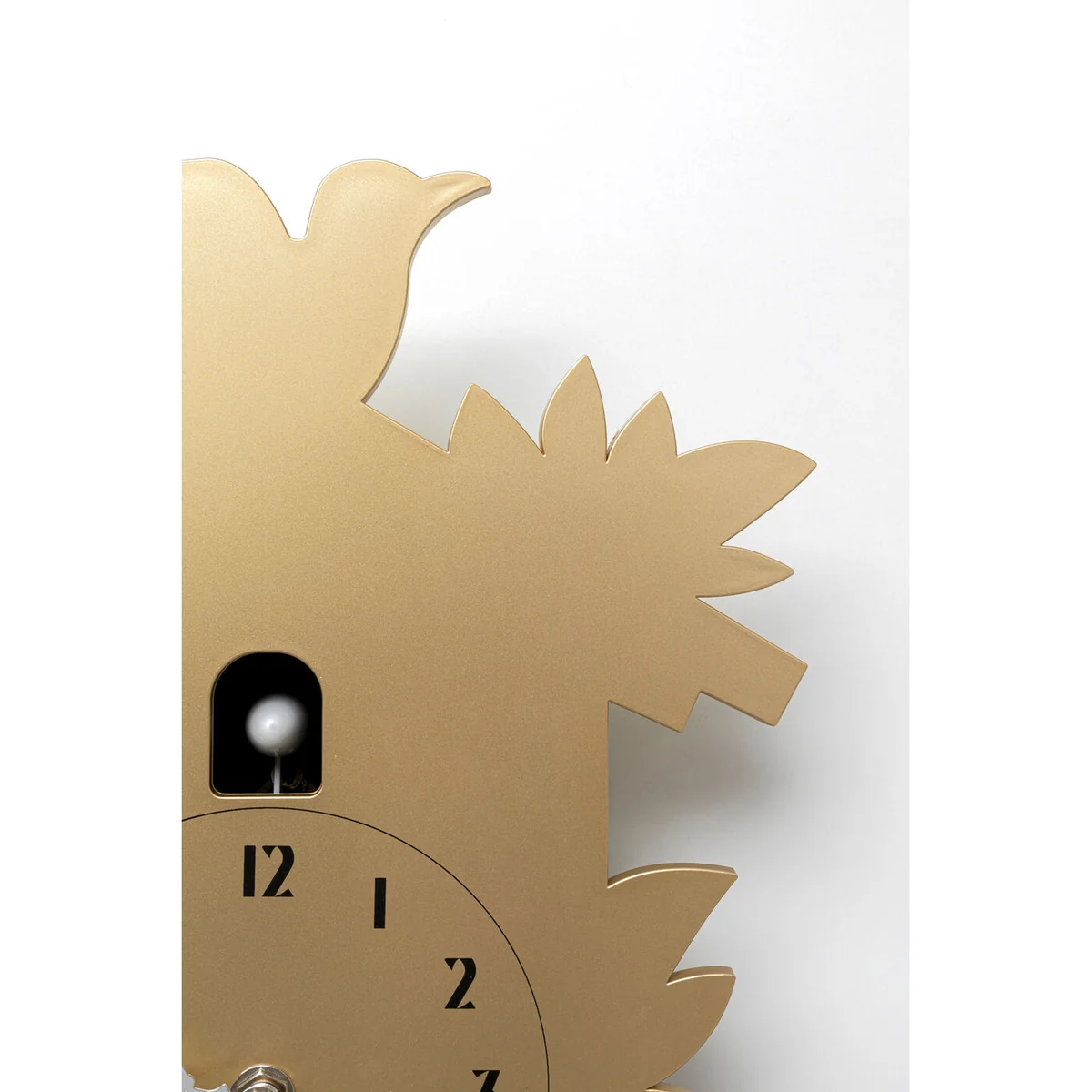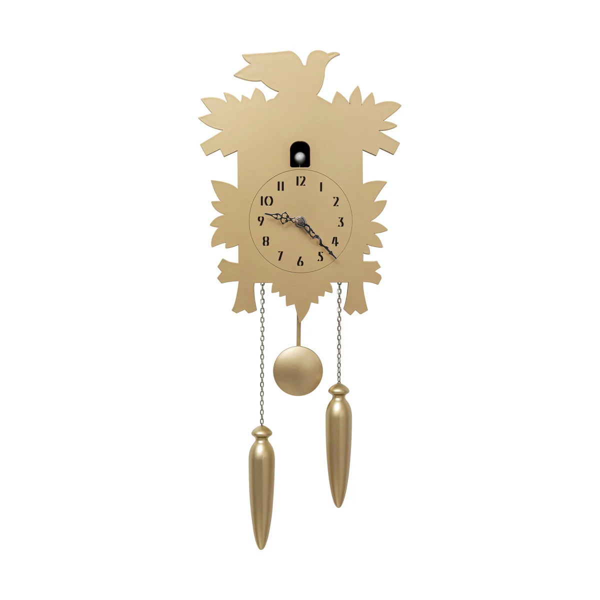 Cuckoo Bird completely reinterprets a piece of German cultural heritage and fires the imagination: in this version the cuckoo sits cheekily on the roof of the clock and keeps quiet at the top of the hour - in other words, the clock doesn't make any cuckoo noises. So nothing stands in the way of your dream of having a modern cuckoo clock in the bedroom. The swinging pendulum provides the clockwork movement while the weights are decoration. This golden clock for the wall in a matt look stands out against white and coloured backgrounds and fits beautifully into elegant and glamorous interior design ensembles.