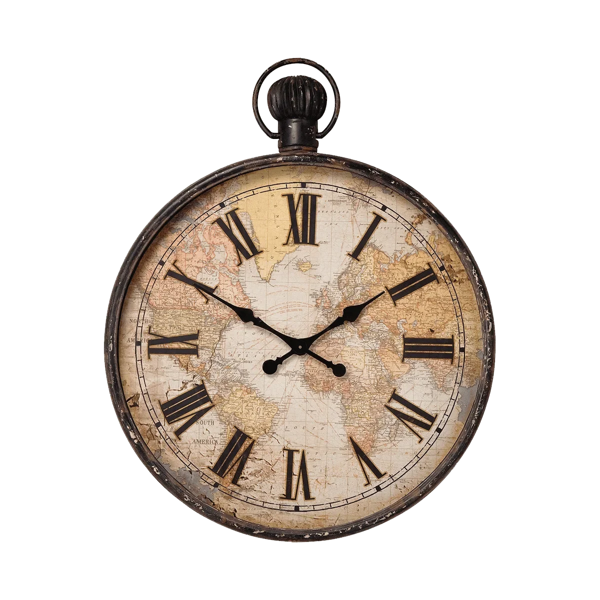 A nostalgic clock with European flair - The world has never seen such a large pocket watch, which is why it is probably better hung on the wall. It's not just a timepiece, it also looks great. The clock features an antique design, with a nostalgic map of Europe decorating its face and numerals in the Roman style. With this clock you will always be in the picture when it comes to knowing the time. This stylish nostalgic clock is brought to life by iron, glass, paper, the mechanism and AA batteries.