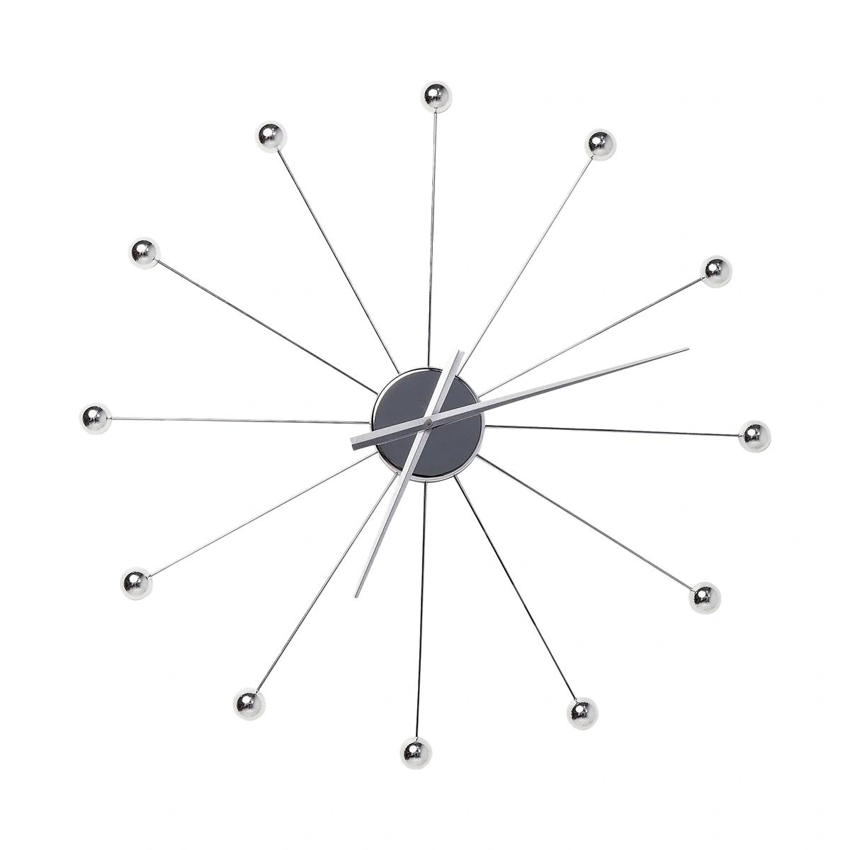 This unusual wall clock will delight you with its sculptural design, which is reminiscent of an open umbrella and adds a modern, artistic touch to any room. The shiny chrome finish provides a radiant accent that conjures up reflections of light and creates an elegant atmosphere. Minimalist numerals complement the clean aesthetic, while the delicate structure brings the wall to life. Perfect for adding a touch of futuristic sophistication to open-plan living areas, stylish kitchens or chic hallways. Combined with clean furniture and metallic accessories, the clock becomes an eye-catcher without being overloaded.