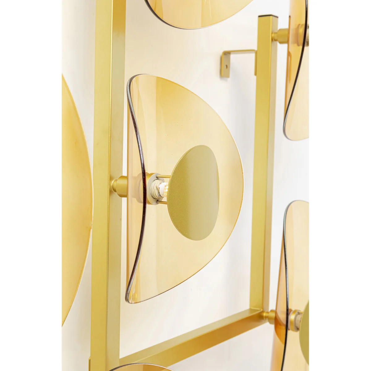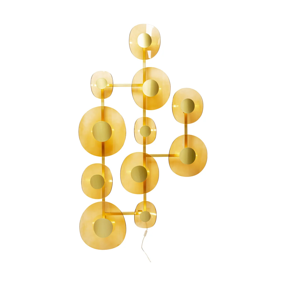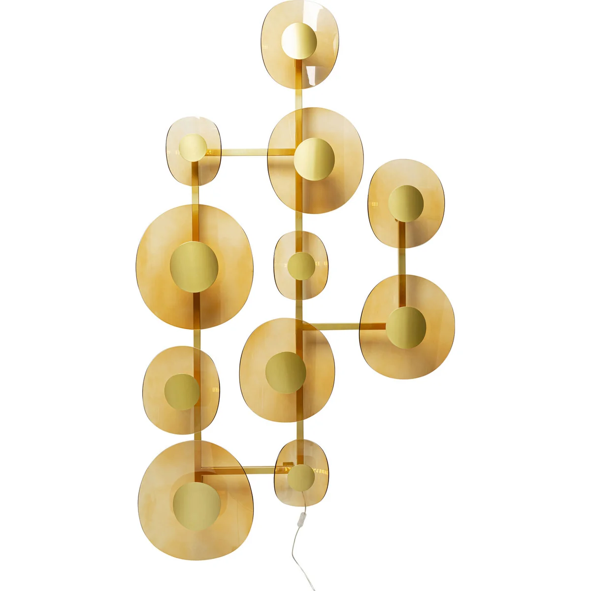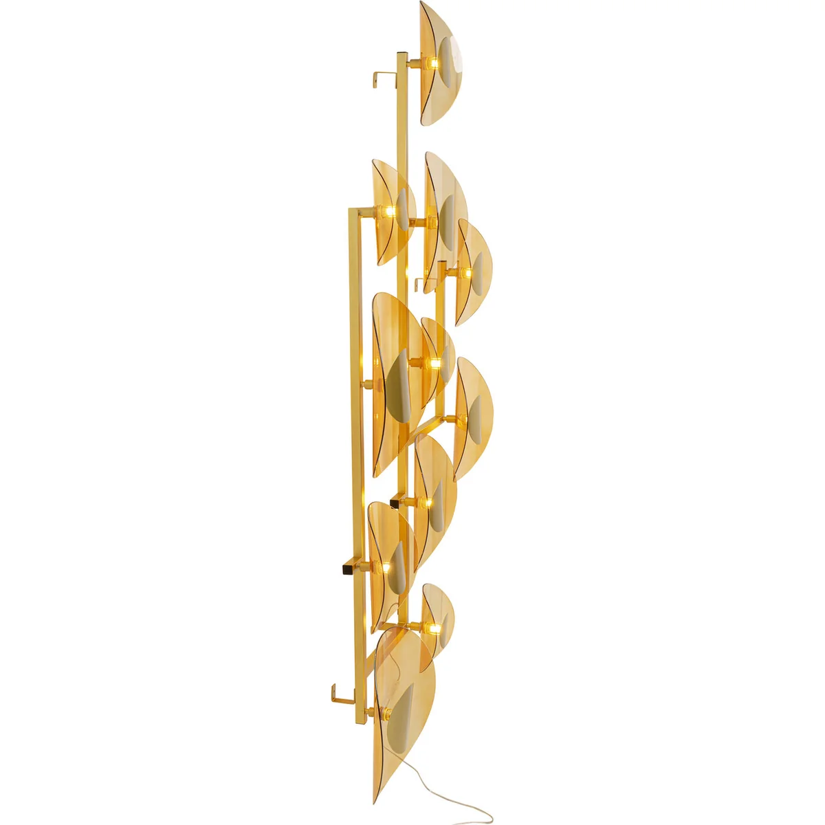 - A grandiose wall decoration and lighting object in one, with 11 lampshades - A high-quality lamp made of nickel-plated steel and coated glass - The colour scheme in gold provides indirect, warm light - Practical with cable and switch - a socket directly in the wall not necessary - At approx. 189 x 11 cm the wall lamp also impresses with its size