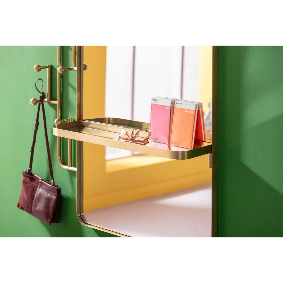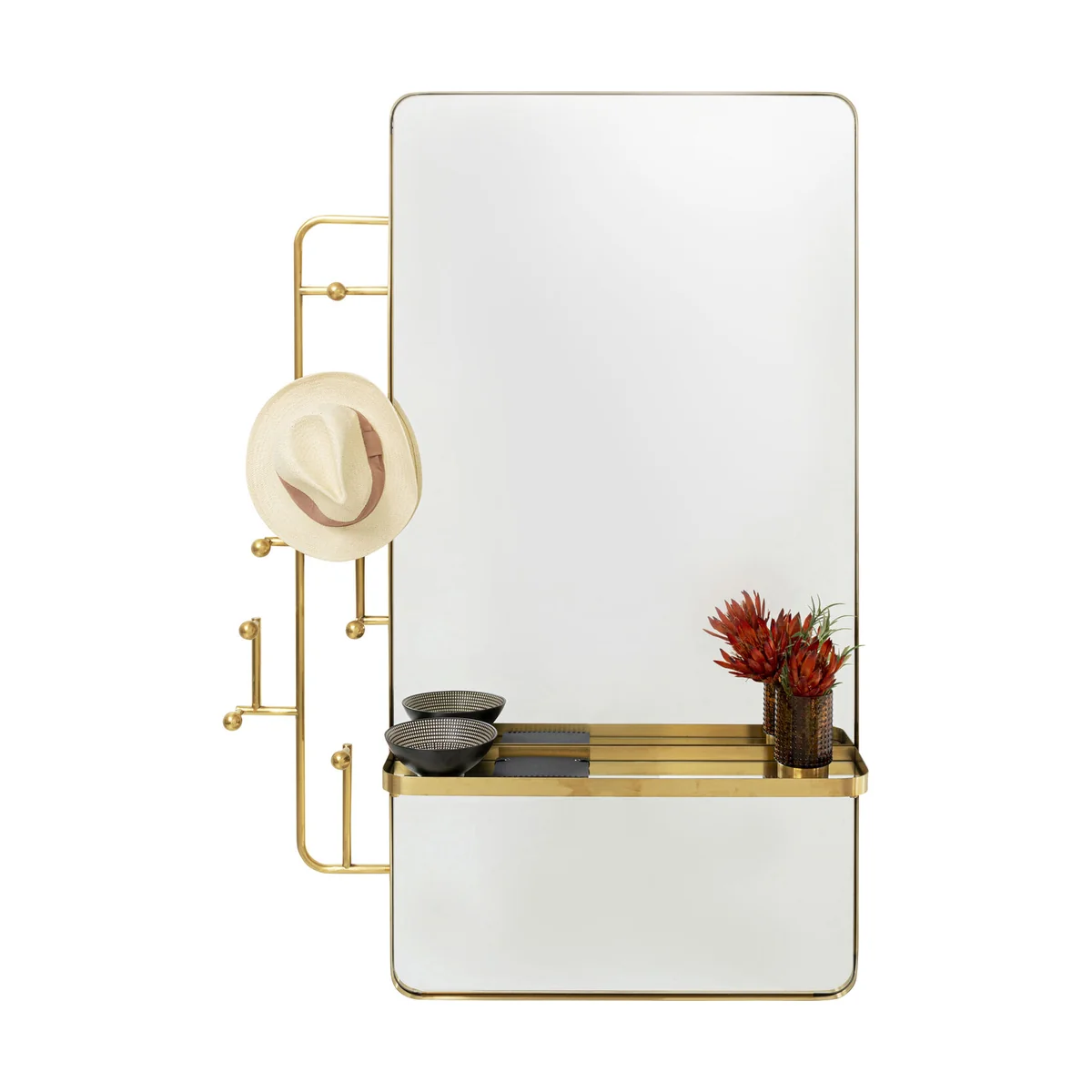 This stylish wall-mounted coat rack is the perfect solution for anyone looking for an elegant and practical solution for hanging clothes. The steel frame is finished in brass and is mounted on the wall. The hallway coat rack features a large mirror with a shelf and several wall-mounted hooks. Whether in the hallway or the bedroom, this cloakroom combination adds a touch of elegance to any room. Take a final look in the mirror to check your outfit and then take your jacket off one of the hooks - with this hallway coat rack every day starts in style!
