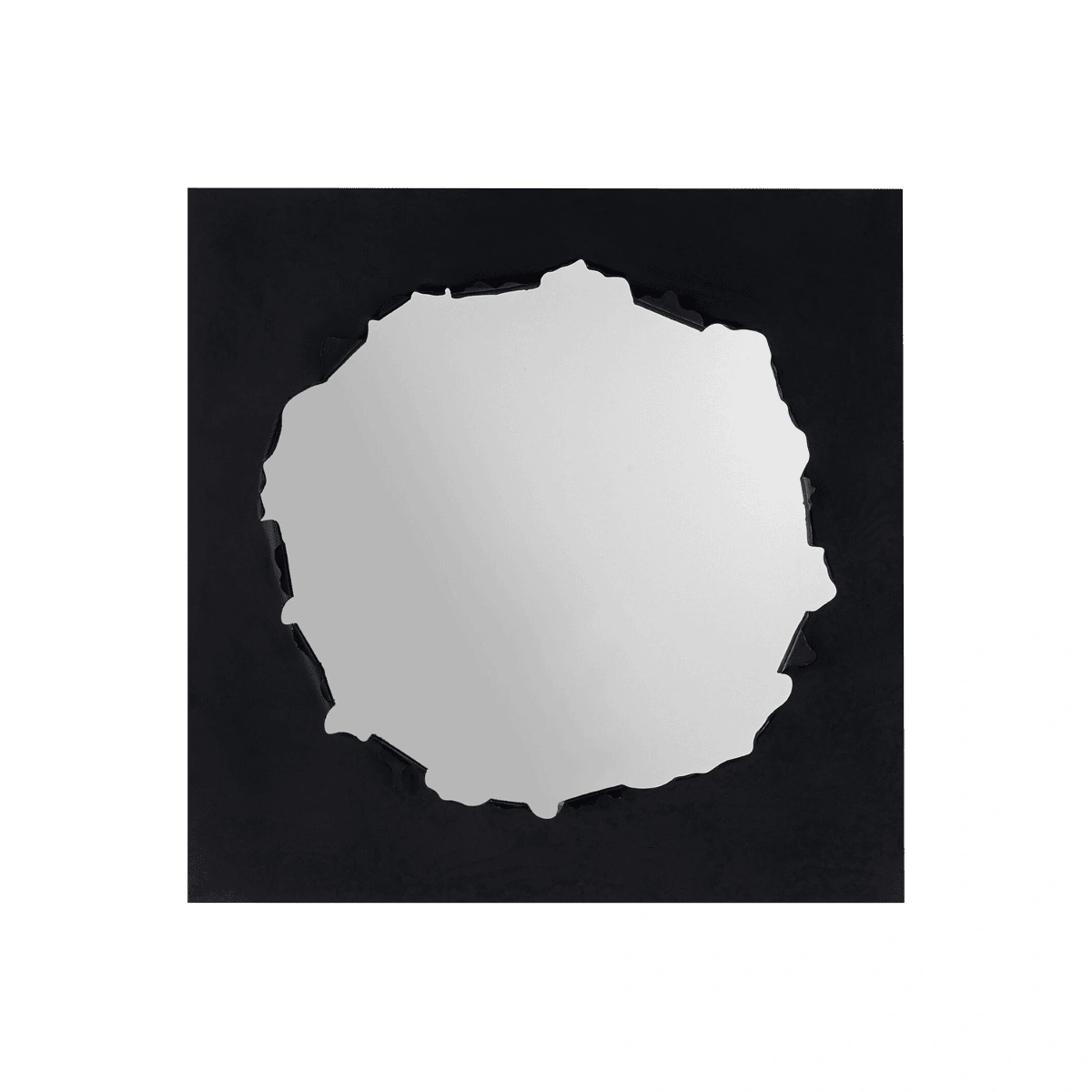 This mirror measures 90x90 cm with a depth of 8.5 cm, combining grand size with a slim profile. The black glass gives a sleek, contemporary feel, while the 'explosion' design adds a striking visual element.